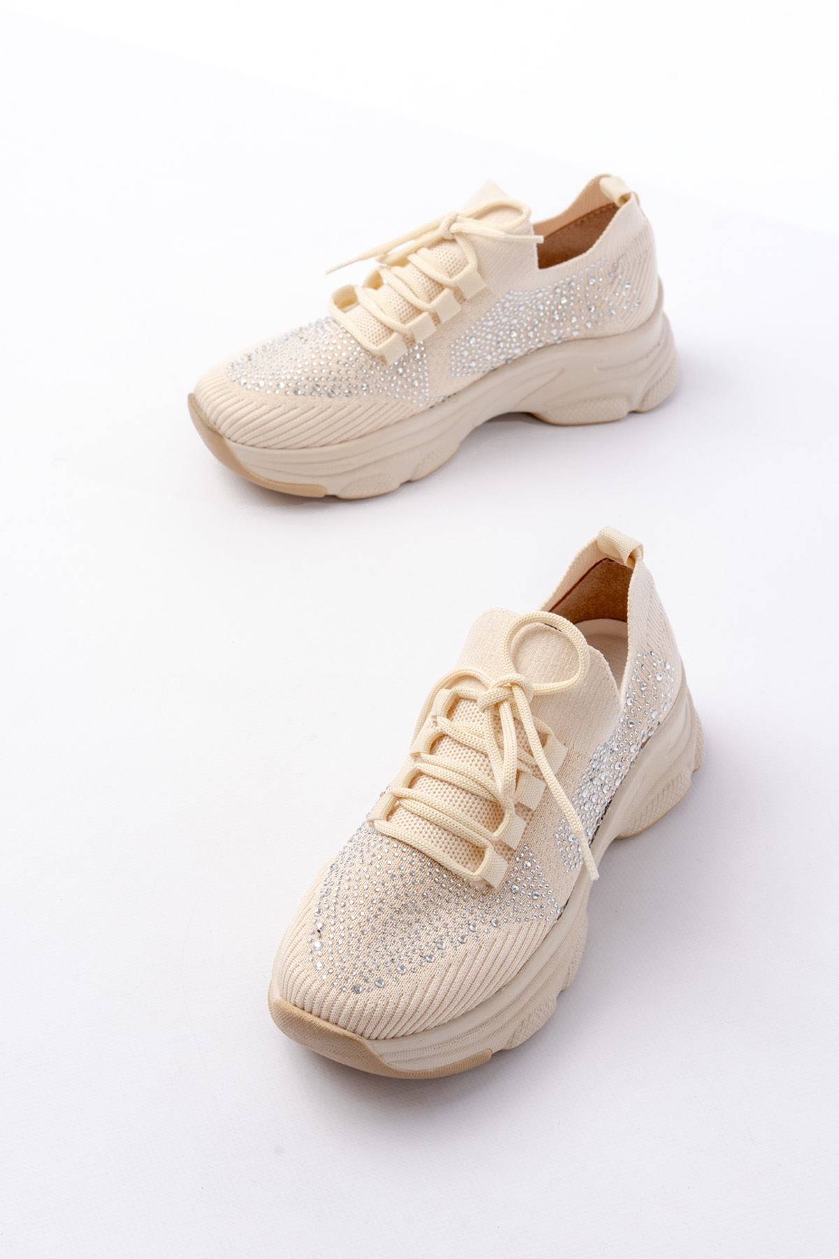 3002 Bej Bağcıklı Fileli Taş Aksesuarlı Günlük Spor Ayakkabı