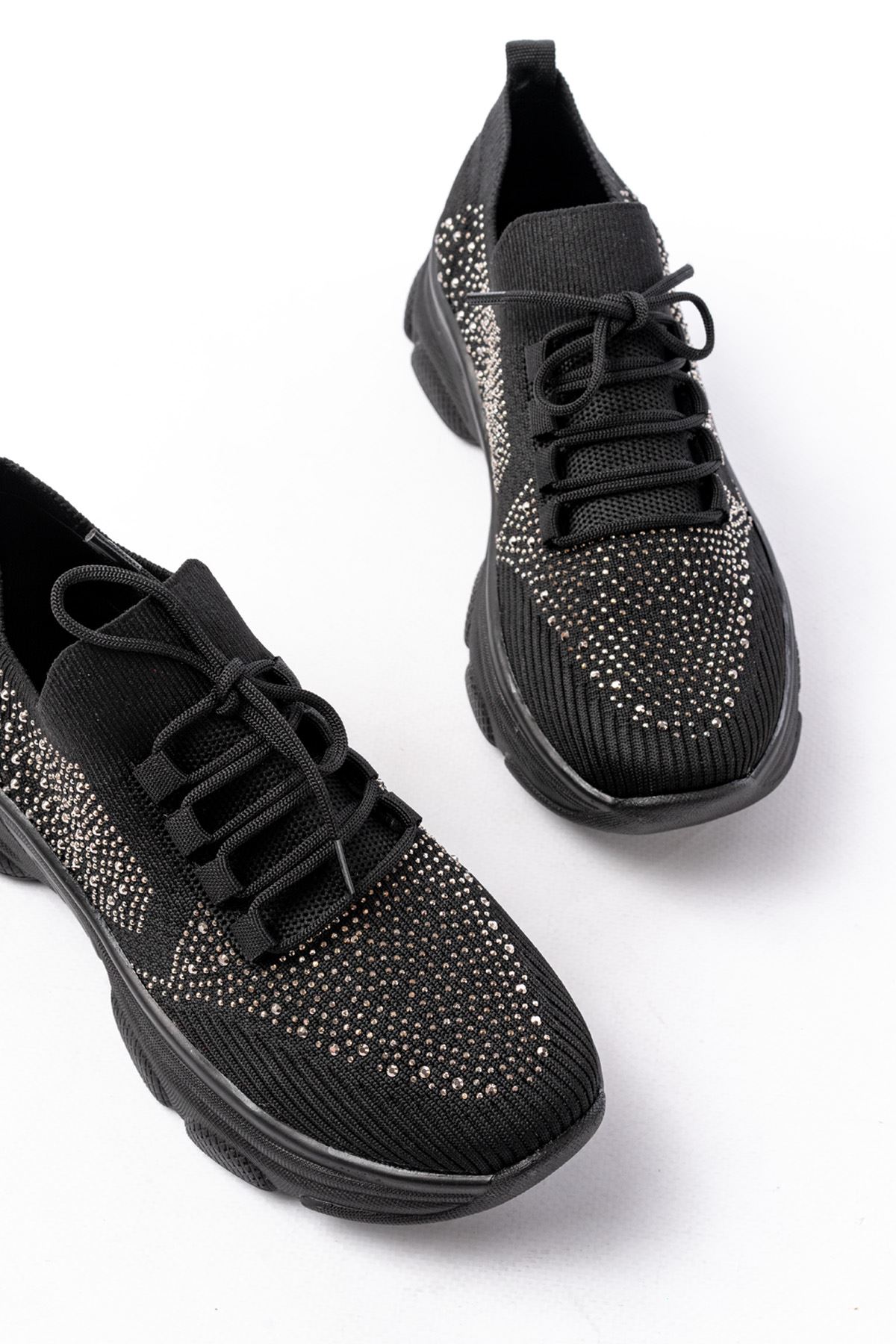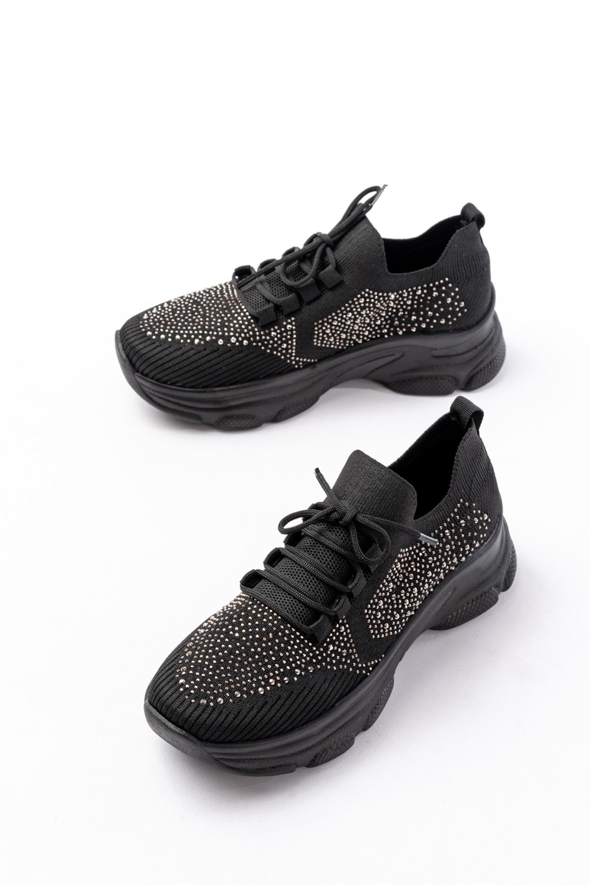 3002 Siyah Bağcıklı Fileli Taş Aksesuarlı Günlük Spor Ayakkabı