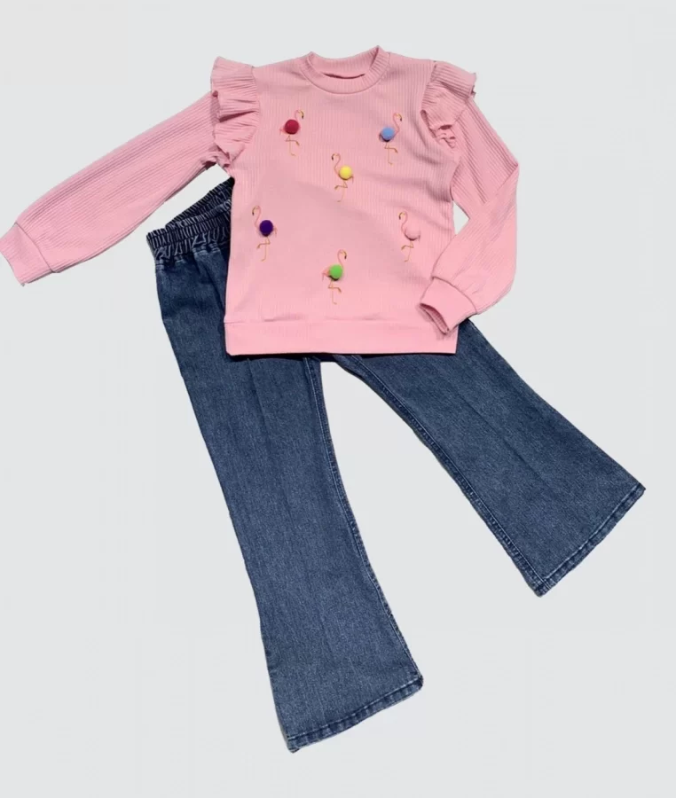 4-5-6 Yaş Kot Pantolonlu Flamingo Desenli Penye Sweat Uzun Kollu 2li Kız Çocuk Takımı Pembe