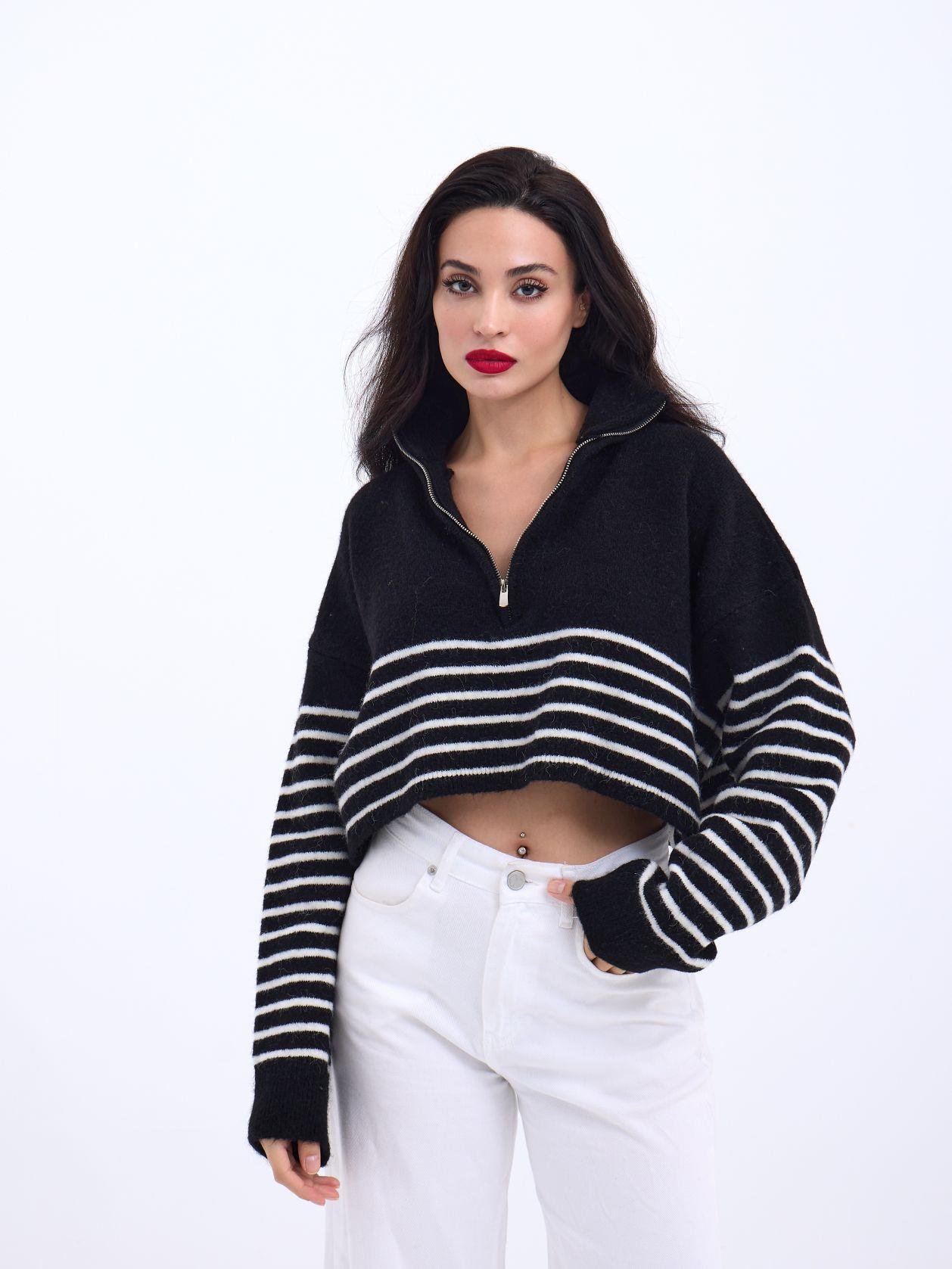 43311 TRİKO ÇİZGİLİ FERMUARLI CROP-SİYAH-EKRU