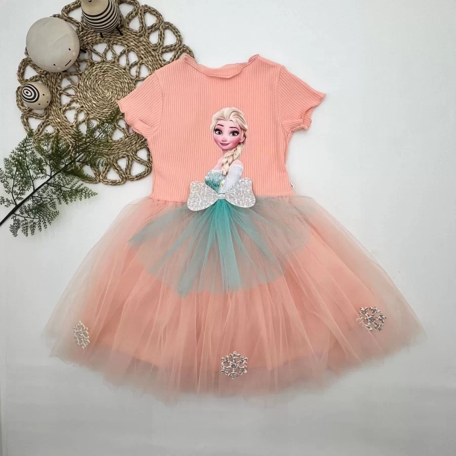 5-6-7 Yaş Elsa Desenli Fiyonklu Tül Etekli Astarlı Kısa Kollu Kız Çocuk Tütü Elbise