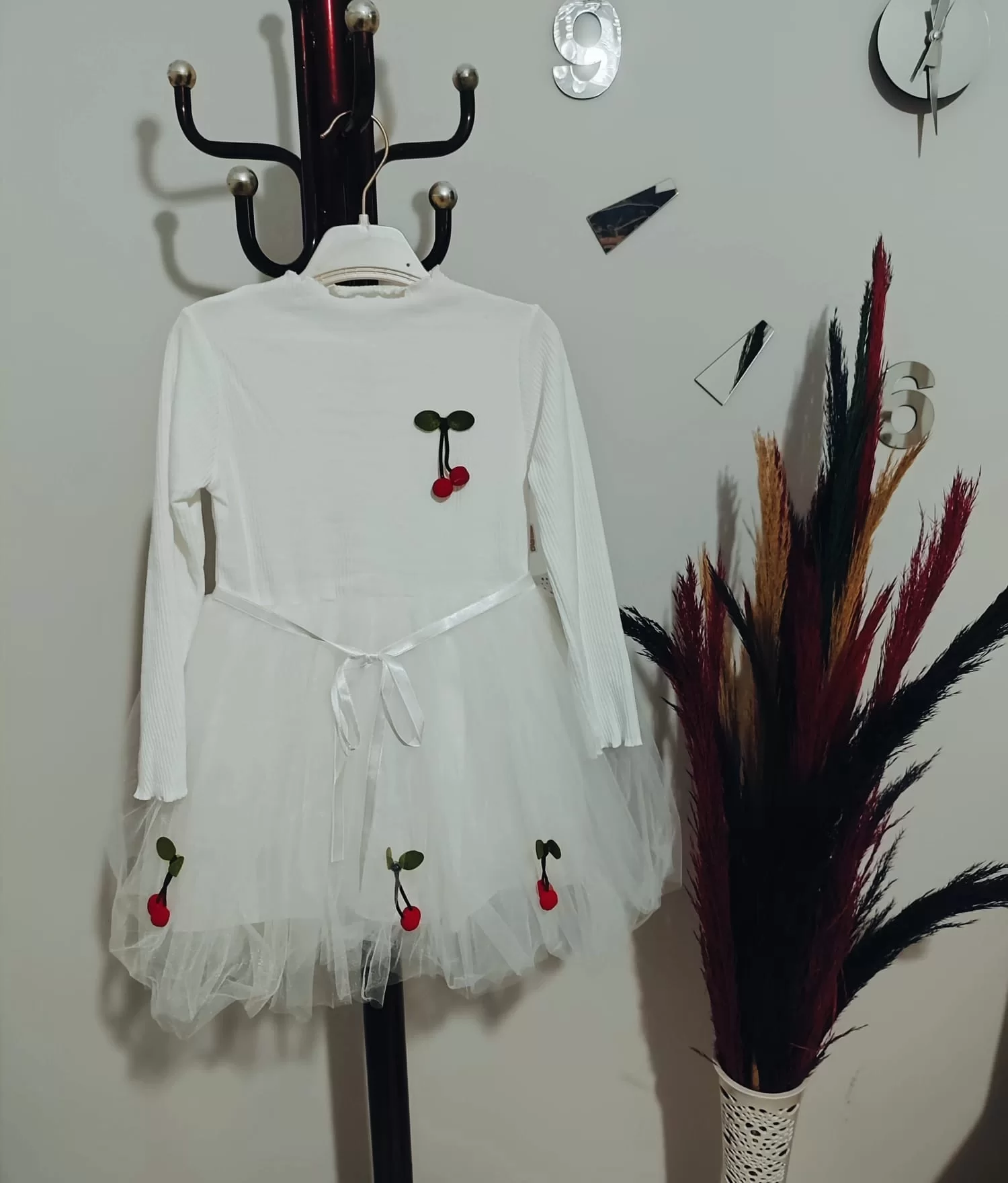 5-6-7 Yaş Kiraz Desenli Kurdela Kuşaklı Astarlı Uzun Kollu Kız Çocuk Tütü Elbise