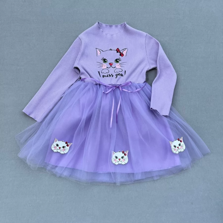 5-6-7 Yaş Minik Kedi Desenli Kurdela Kuşaklı Astarlı Kız Çocuk Tütü Elbise Lila