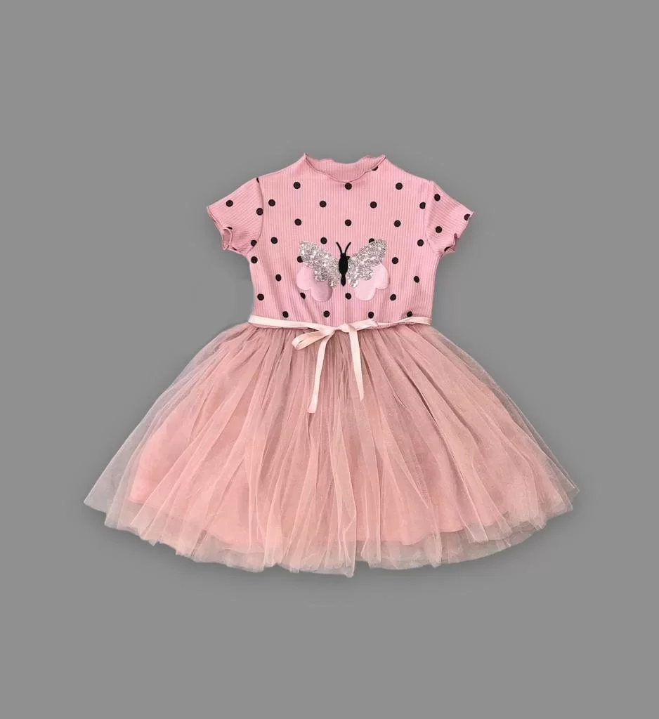 5-6-7 Yaş Payetli Kelebek Desenli Puantiyeli Kız Çocuk Elbisesi