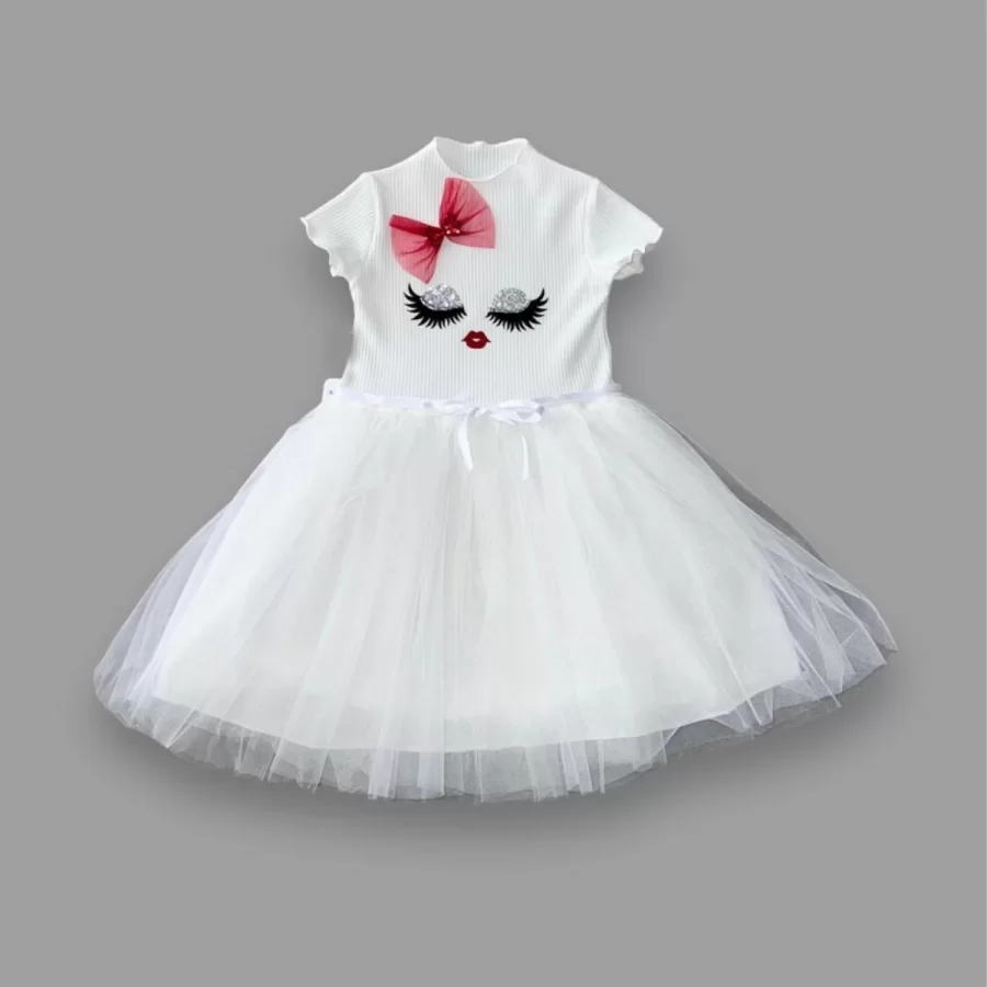 5-6-7 Yaş Payetli Süslü Yüz Baskılı Kız Çocuk Elbisesi