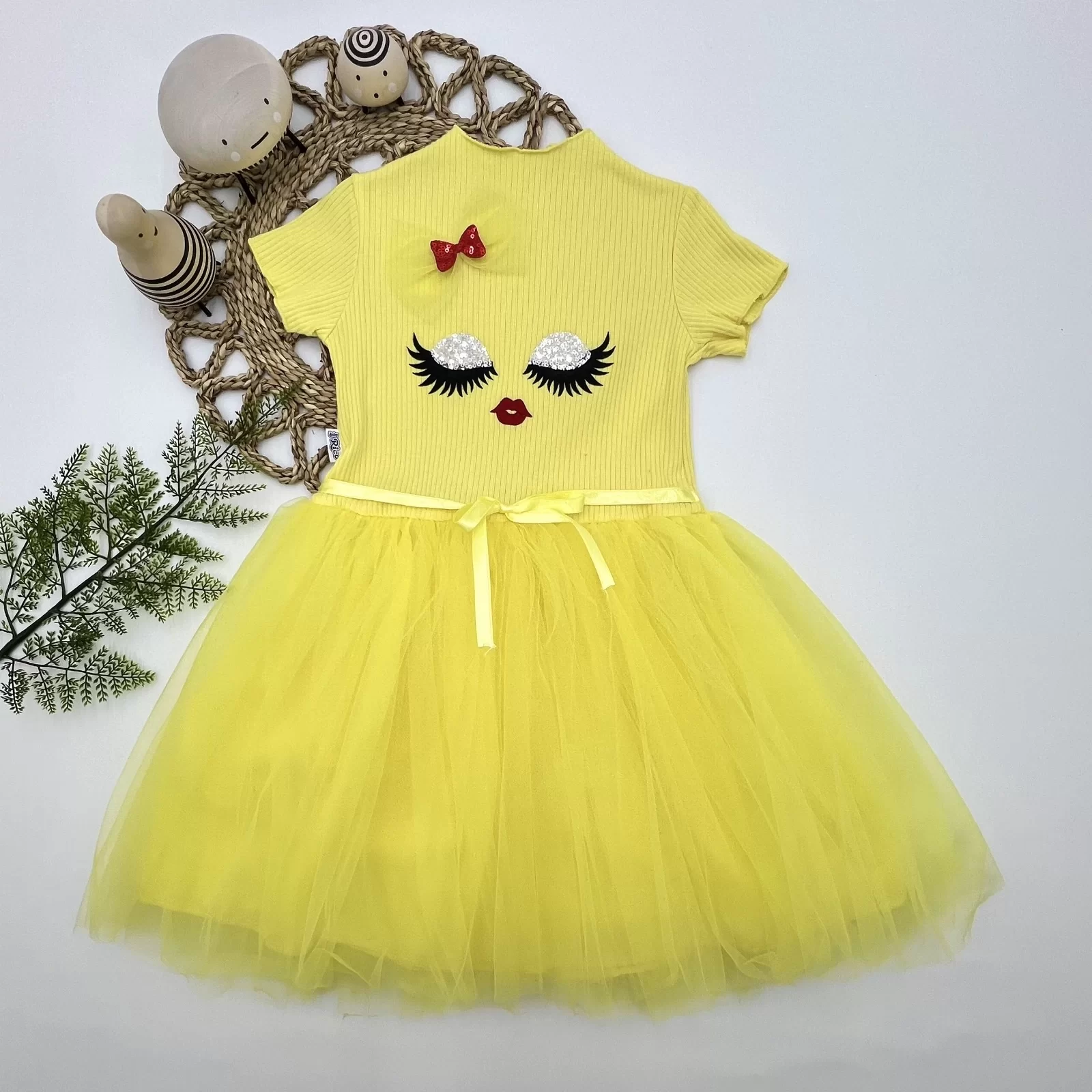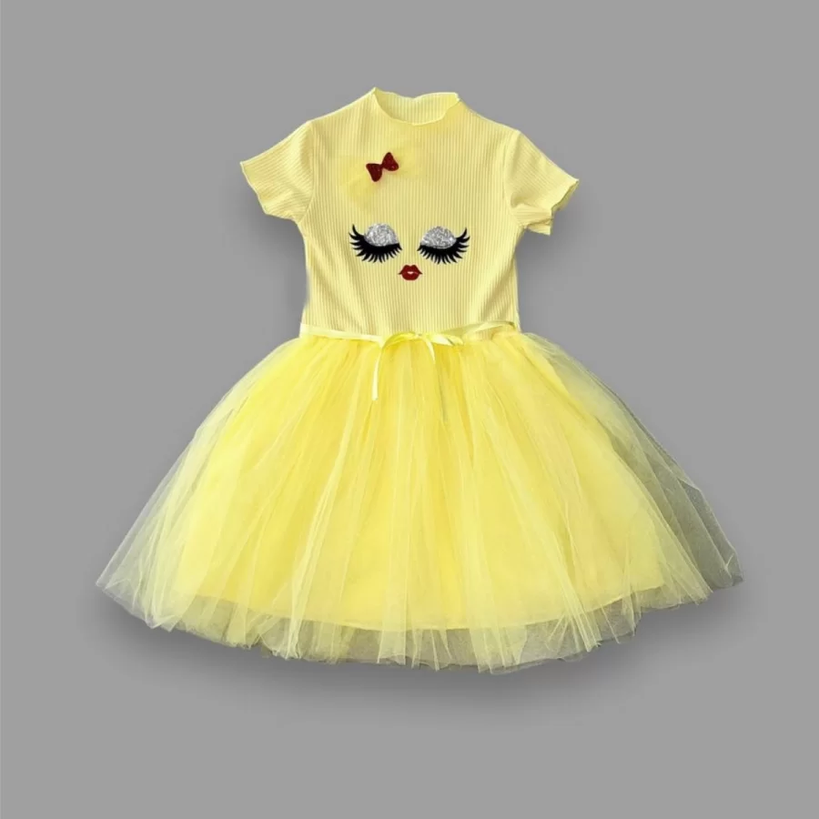 5-6-7 Yaş Payetli Süslü Yüz Baskılı Kız Çocuk Elbisesi