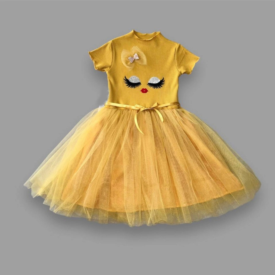 5-6-7 Yaş Payetli Süslü Yüz Baskılı Kız Çocuk Elbisesi Hardal