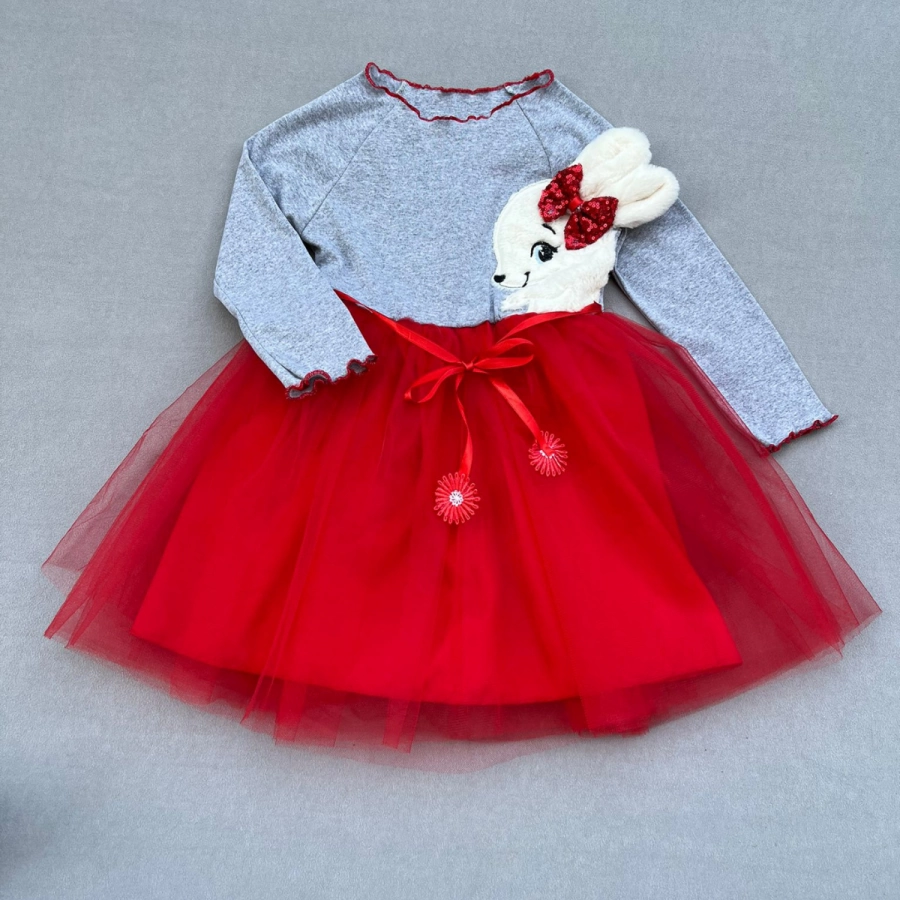 5-6-7 Yaş Pelüş Tavşan Desenli Kurdela Kuşaklı Astarlı Kız Çocuk Tütü Elbise Kırmızı