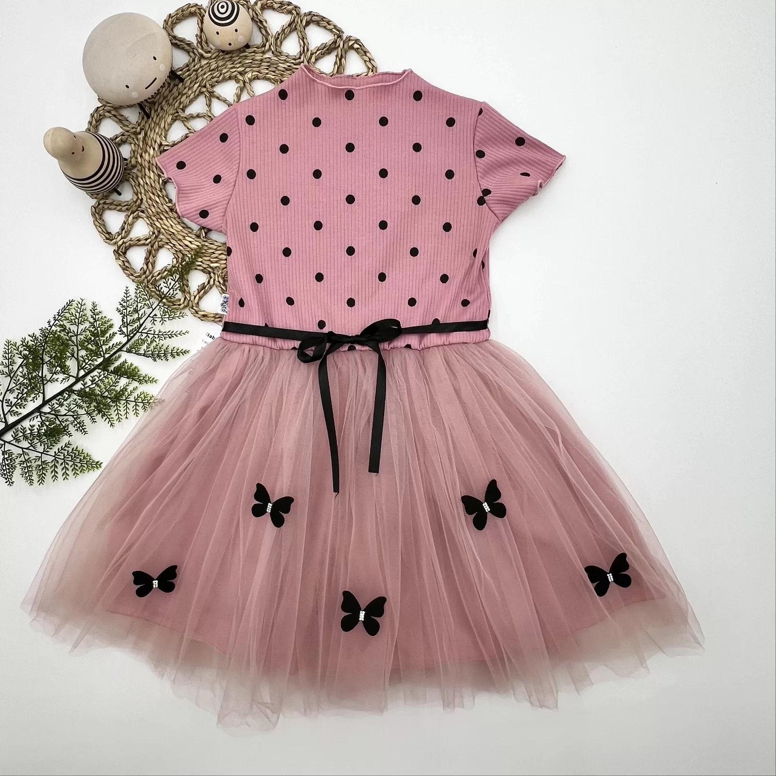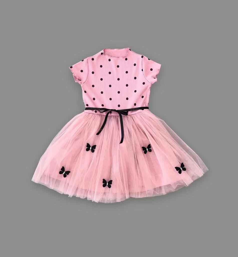 5-6-7 Yaş Puantiyeli Kelebek Etekli Astarlı Kız Çocuk Elbisesi
