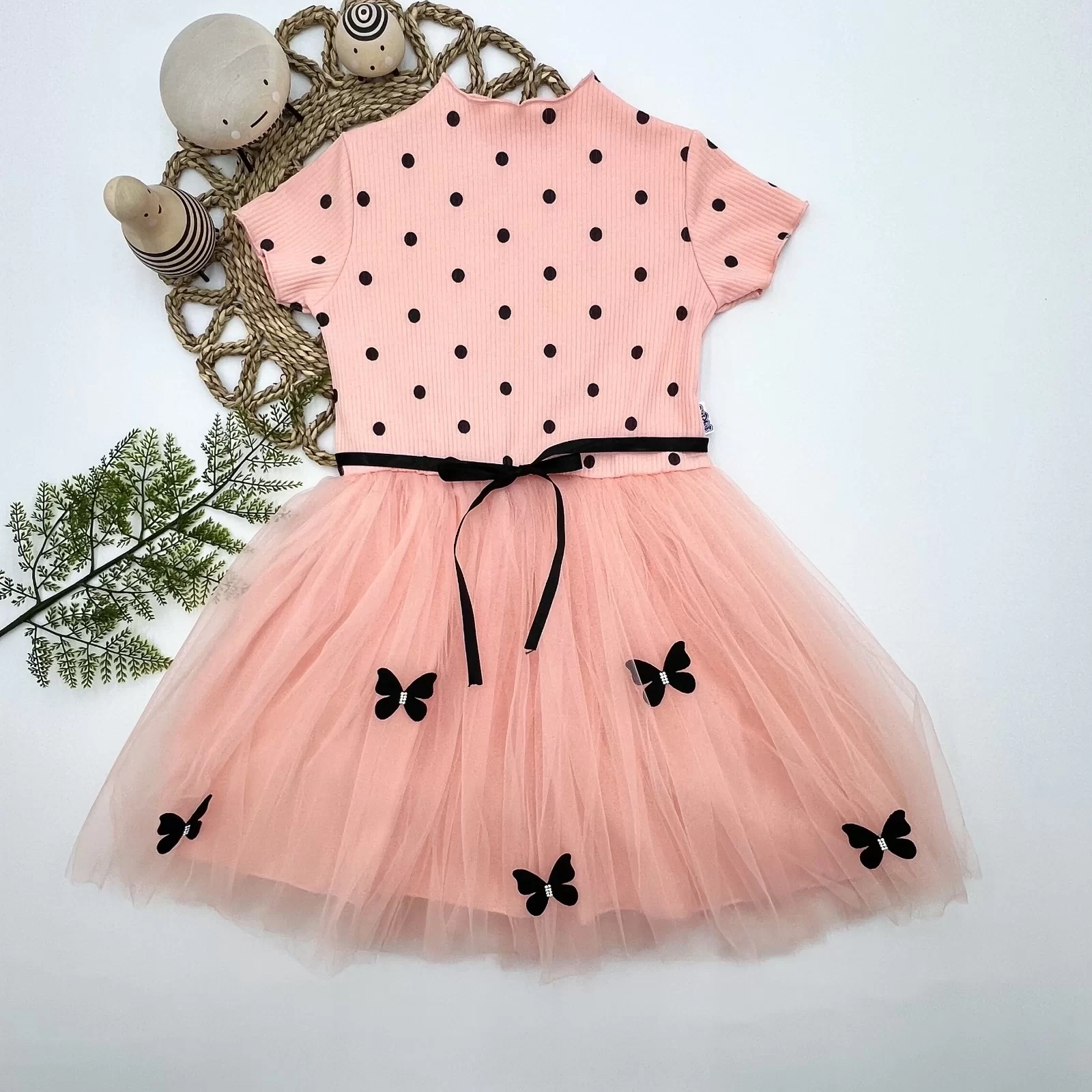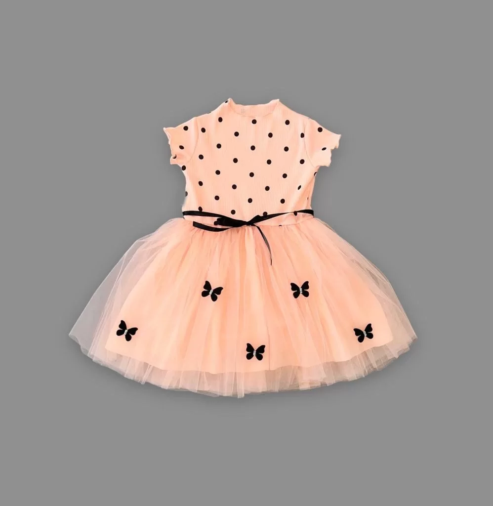5-6-7 Yaş Puantiyeli Kelebek Etekli Astarlı Kız Çocuk Elbisesi
