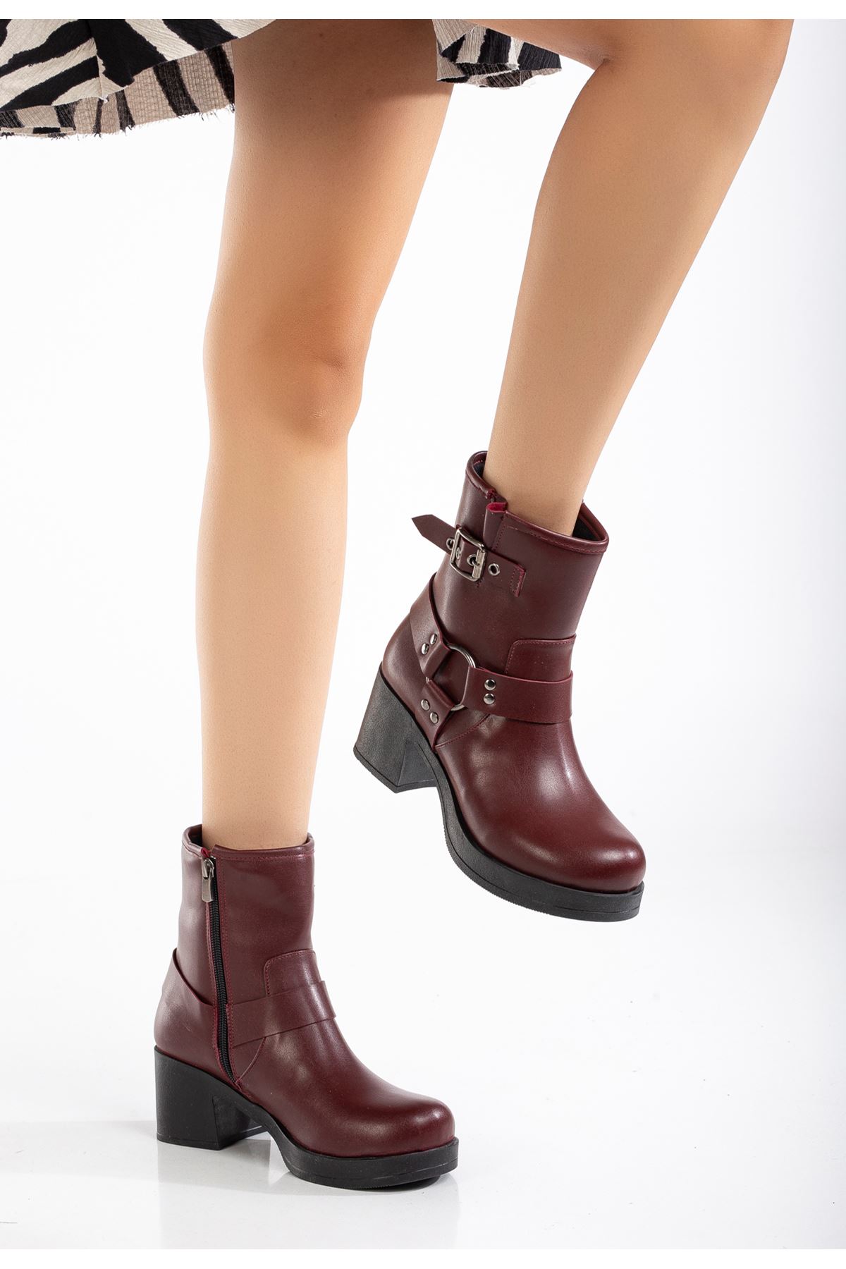 5109-3042 Bordo Toka Aksesuarlı Fermuarlı Kalın Topuklu Günlük Kadın Bot