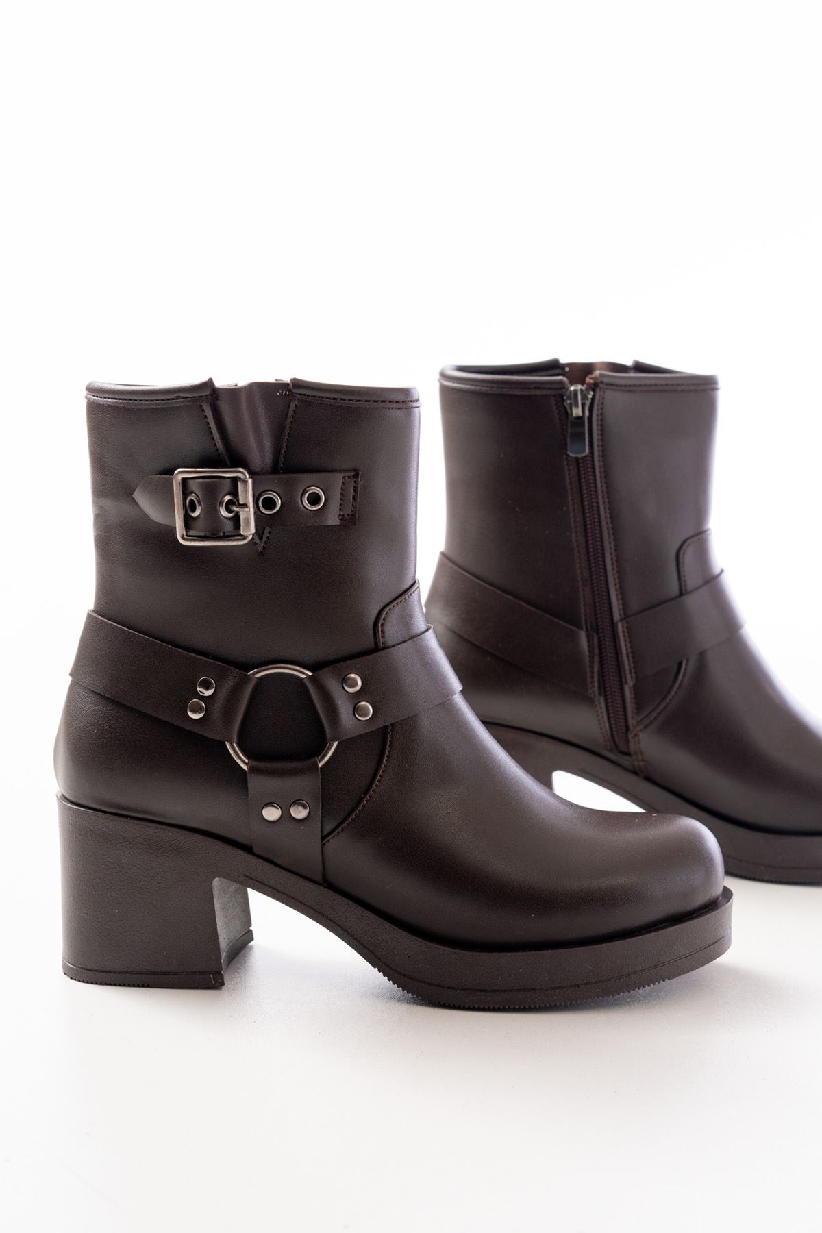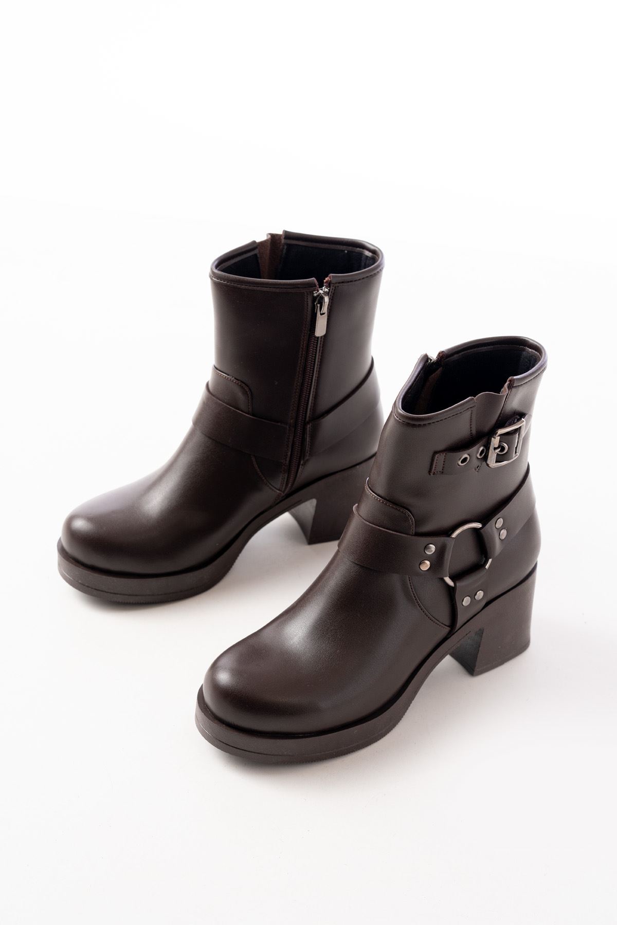 5109-3042 Kahverengi Toka Aksesuarlı Fermuarlı Kalın Topuklu Günlük Kadın Bot