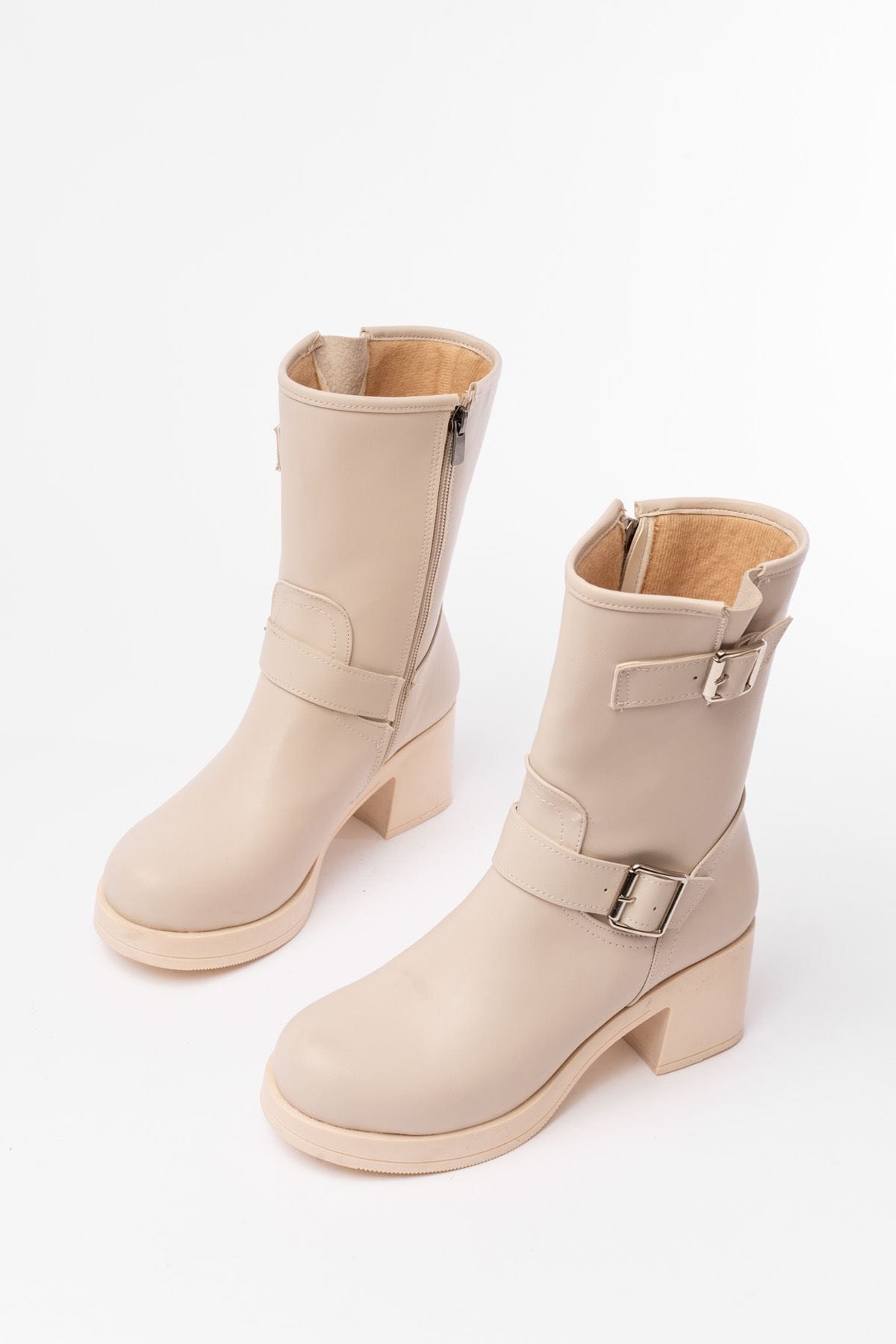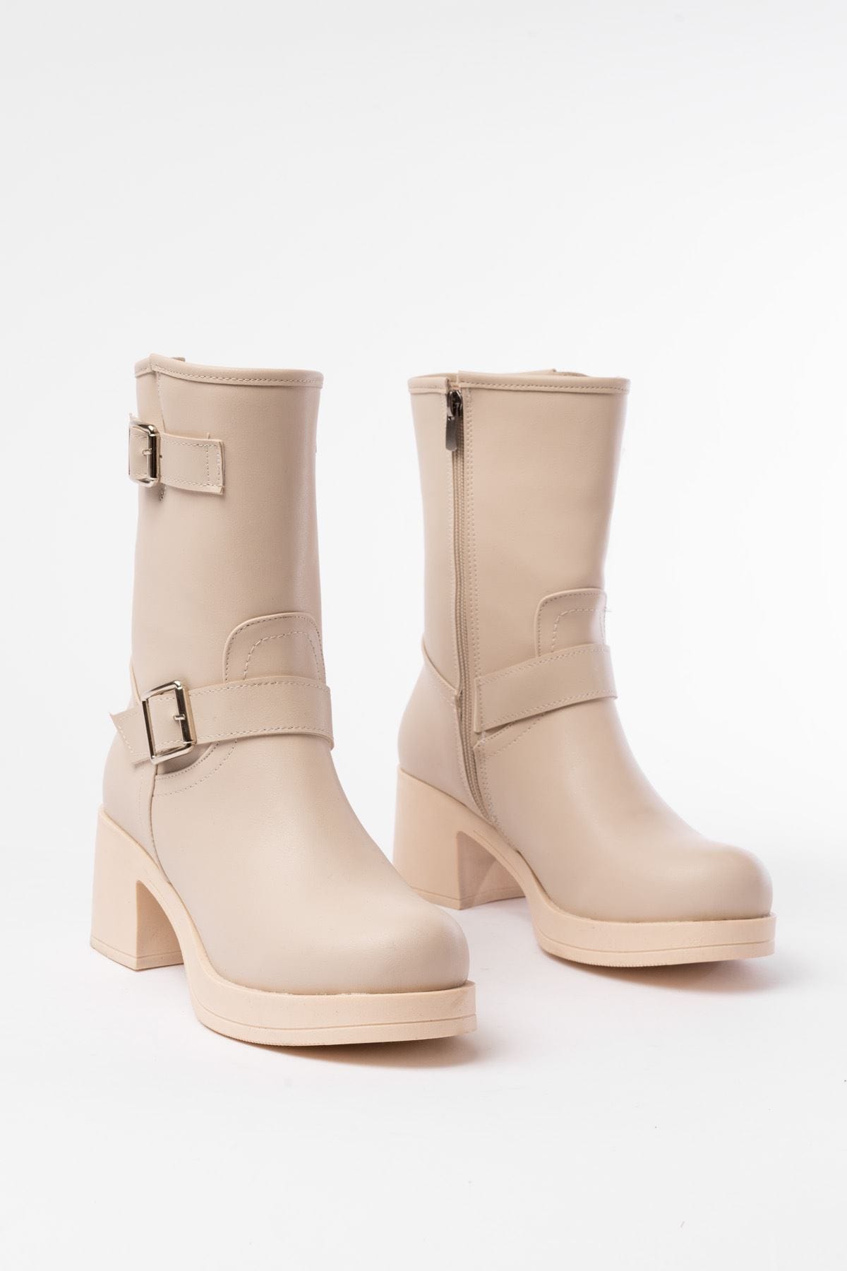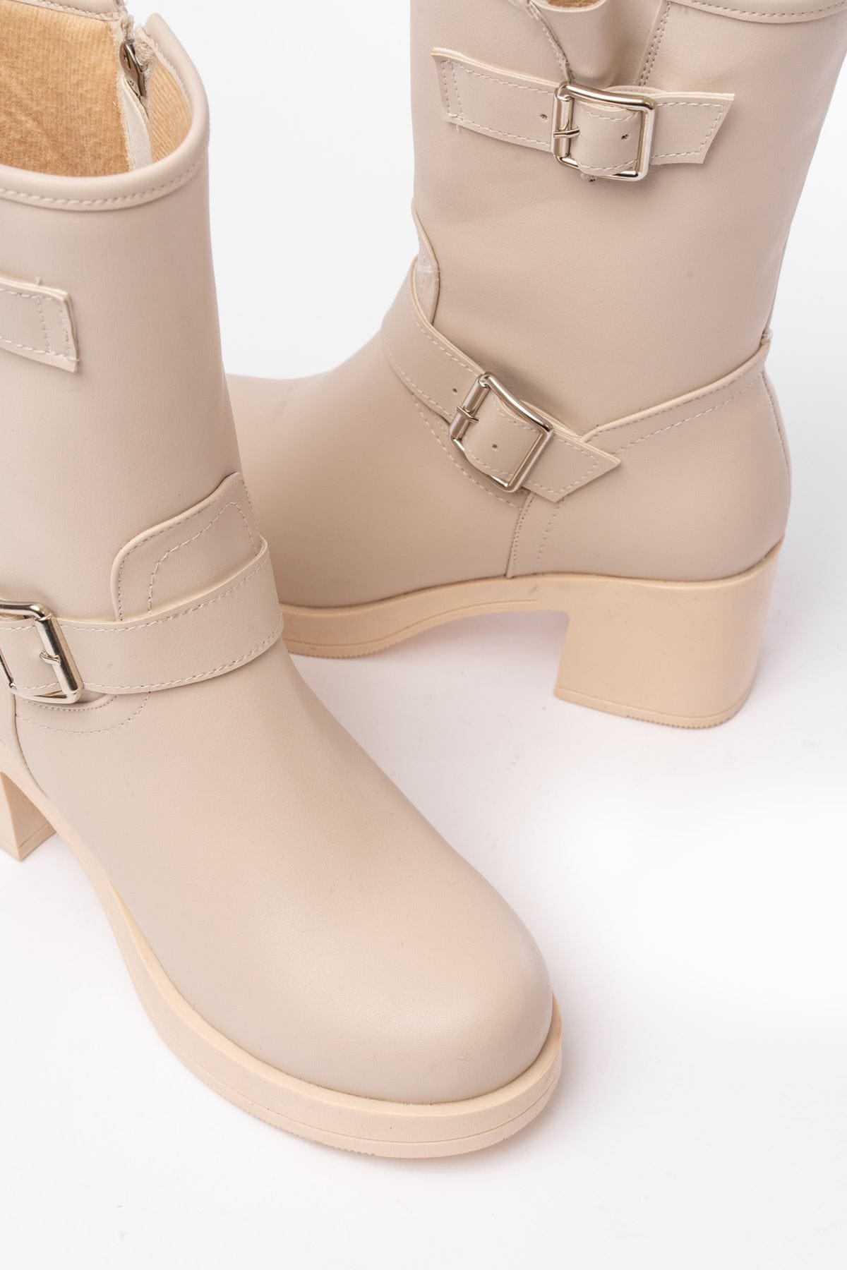 5109-3043 Bej Toka Aksesuarlı Fermuarlı Kalın Topuklu Günlük Kadın Bot
