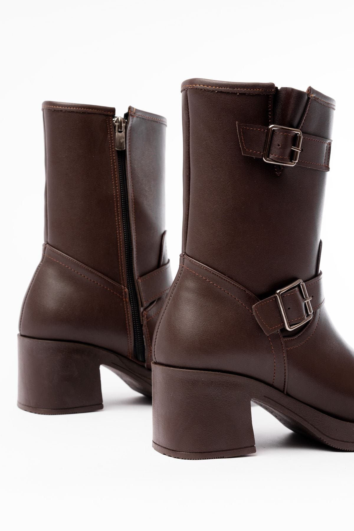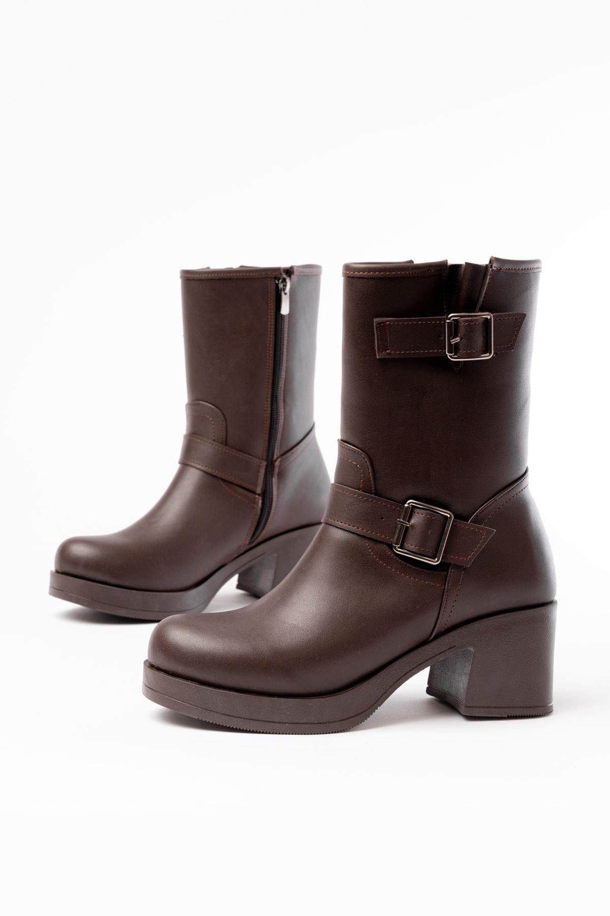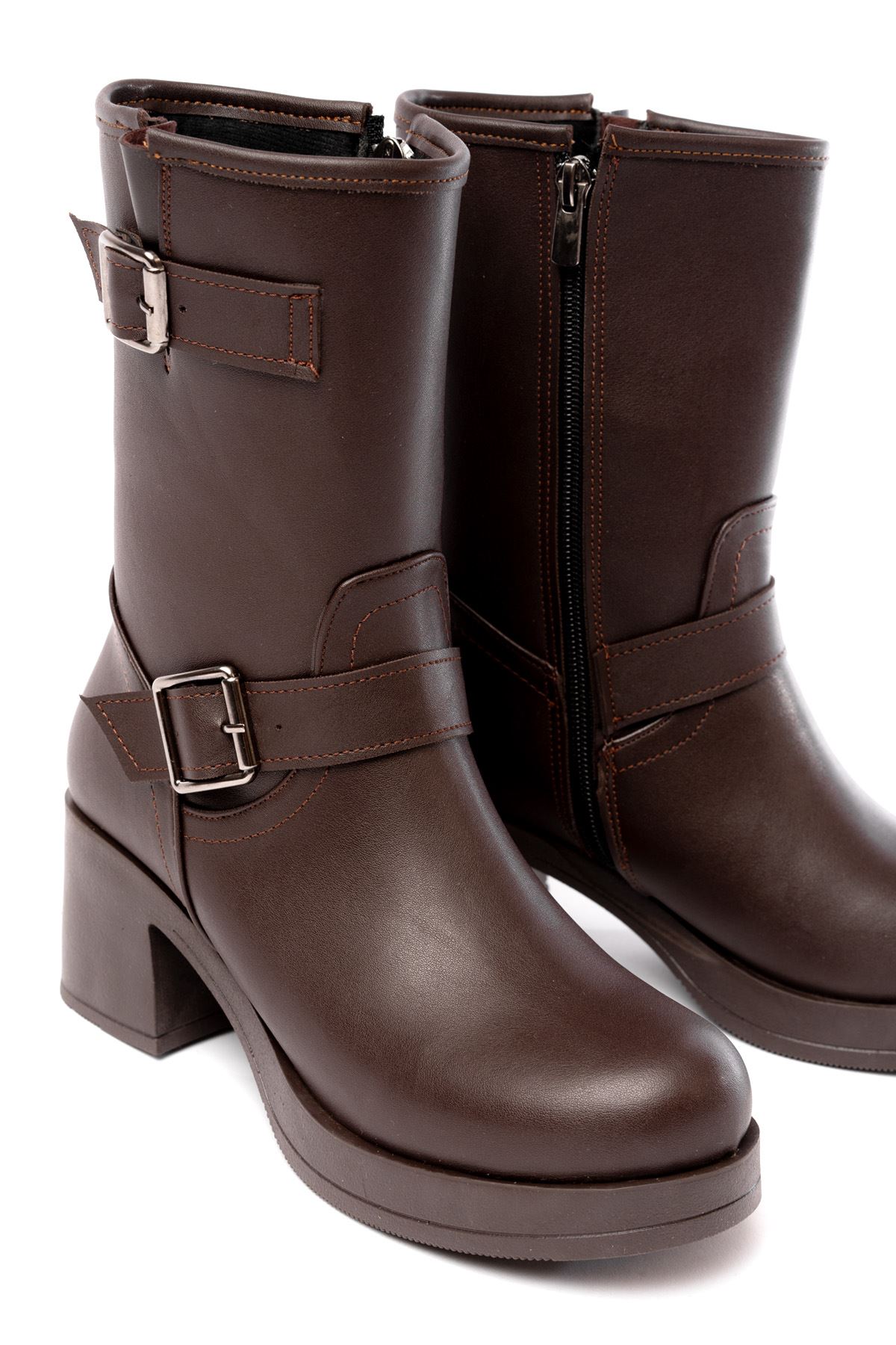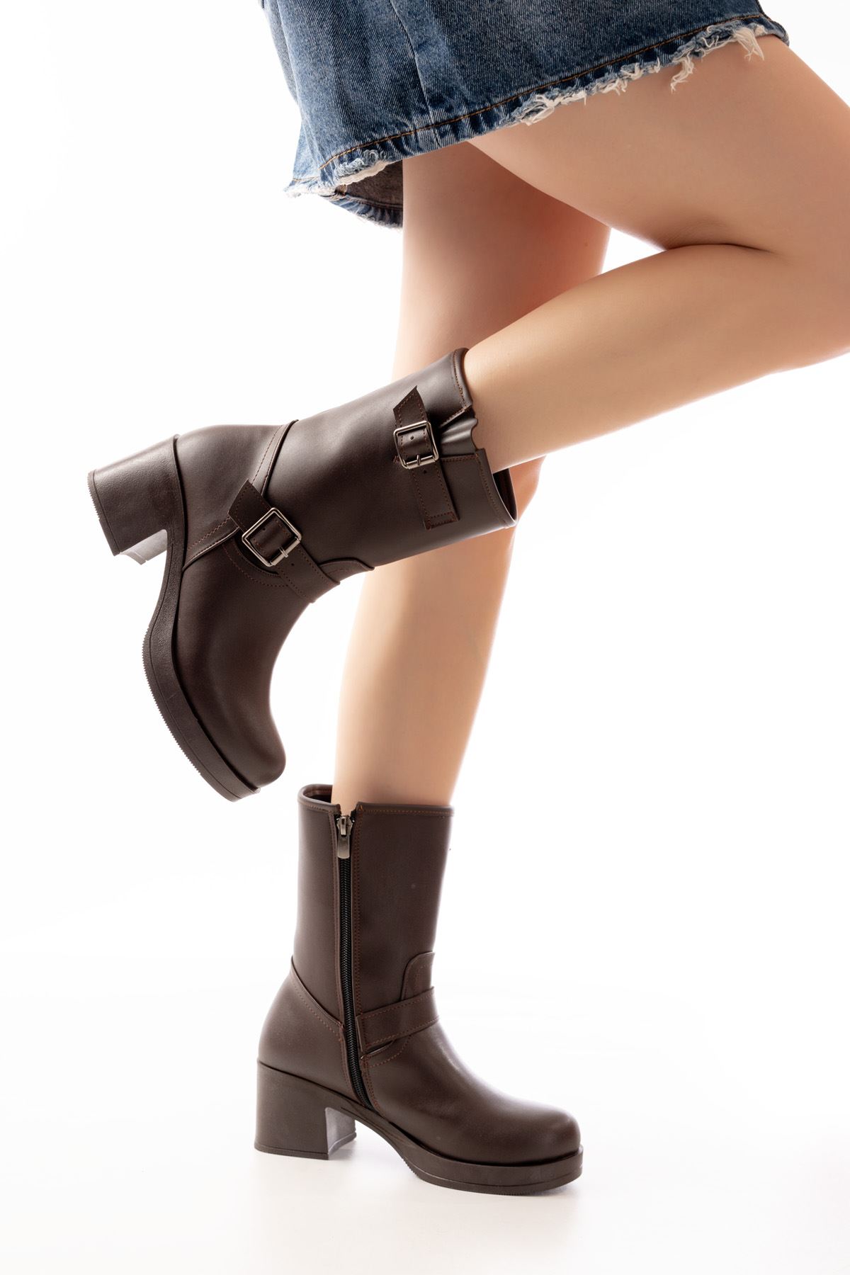 5109-3043 Kahverengi Toka Aksesuarlı Fermuarlı Kalın Topuklu Günlük Kadın Bot