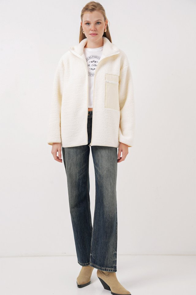 55446 Fermuarlı Oversize Peluş Mont – Bej