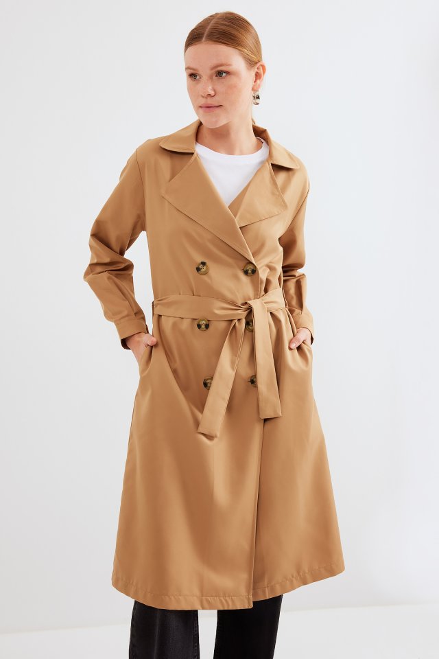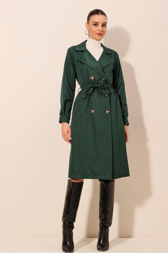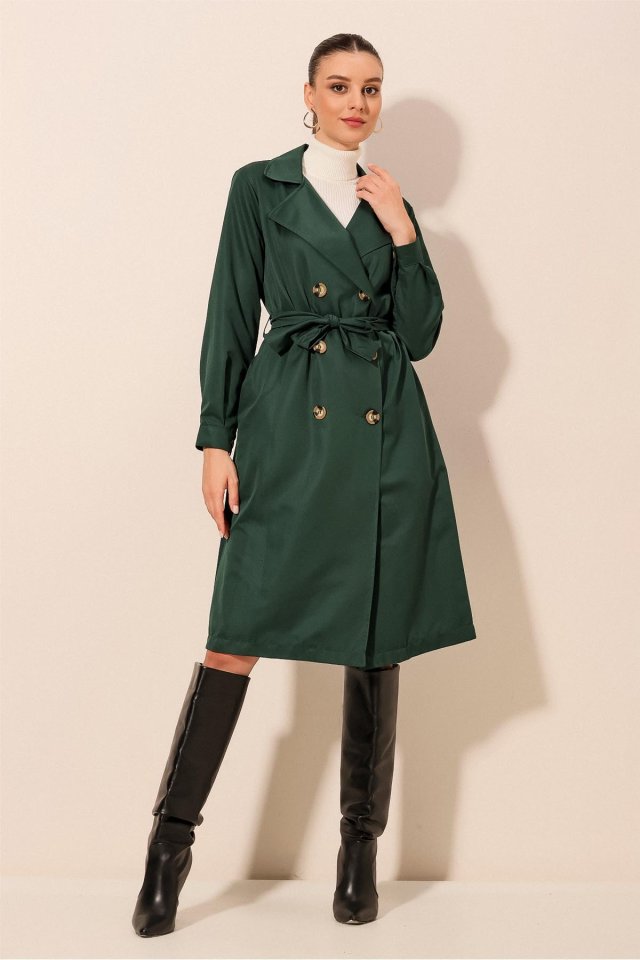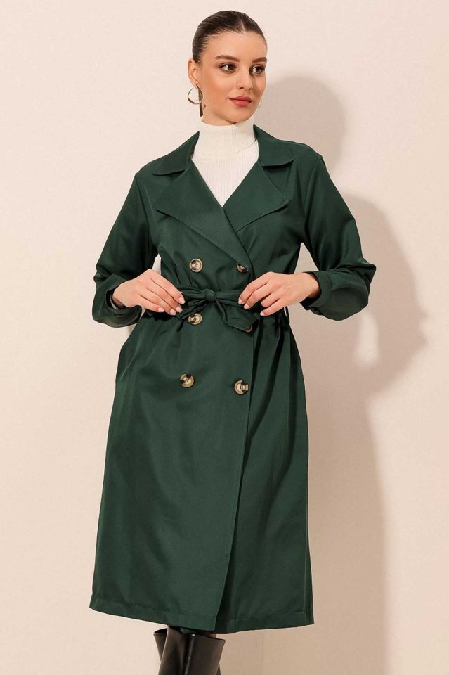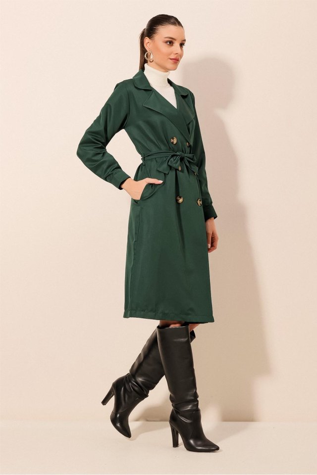 5853 Kruvaze Yaka Trençkot – Zümrüt Yeşili