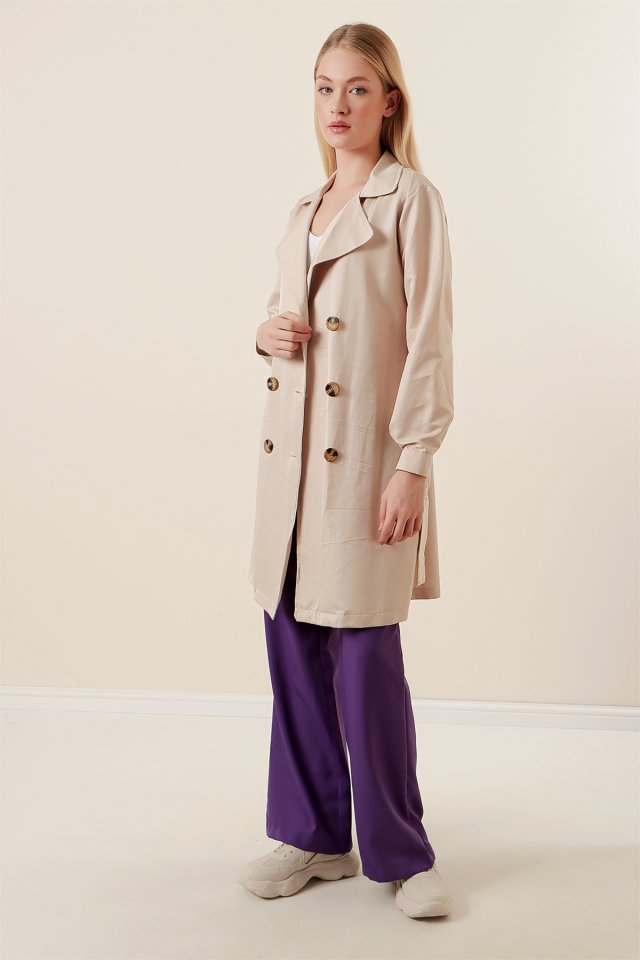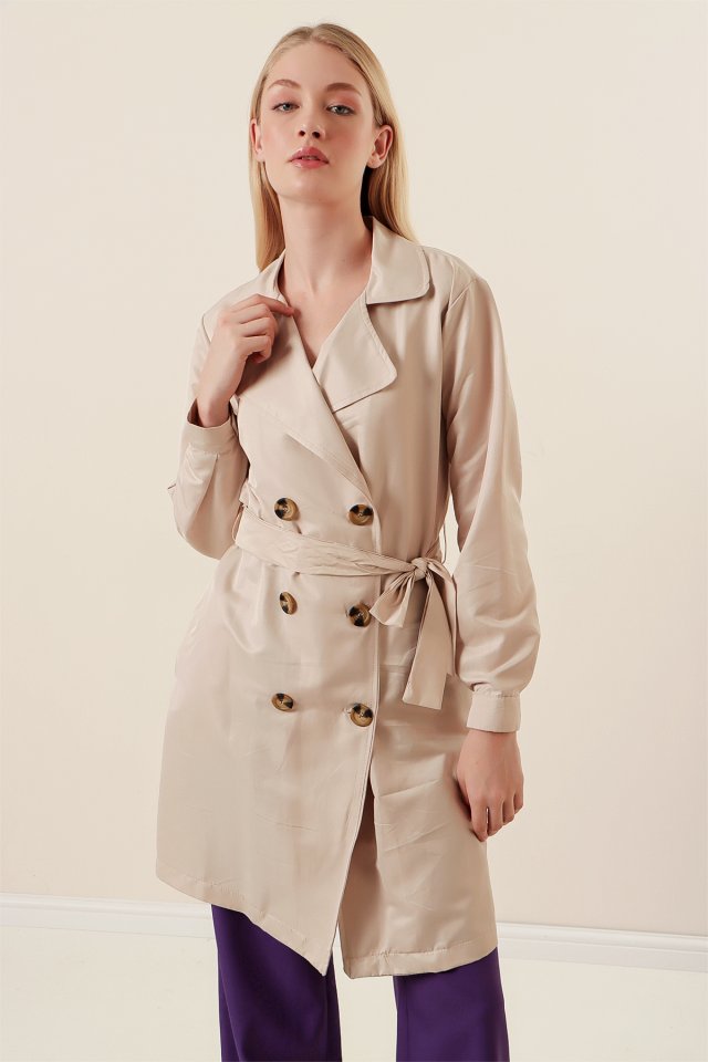 5864 Kruvaze Yaka Kısa Trençkot – Bej
