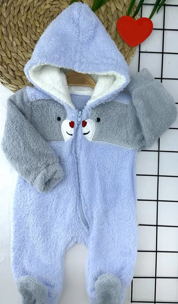 6-9-12-18 Ay Boydan Fermuarlı Welsoft Tüylü Kumaş Kapşonlu Patikli Kız Erkek Bebek Tulumu Mavi