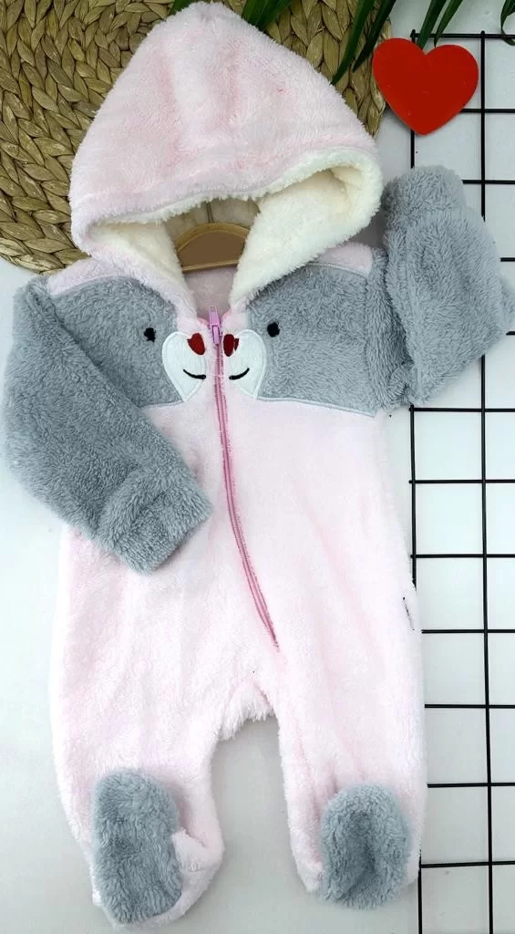 6-9-12-18 Ay Boydan Fermuarlı Welsoft Tüylü Kumaş Kapşonlu Patikli Kız Erkek Bebek Tulumu Pembe