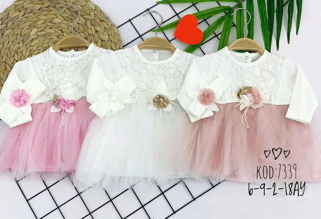 6-9-12-18 Ay Dalga Desenli Bandanalı Astarlı Kız Bebek Elbisesi Gül Kurusu adet