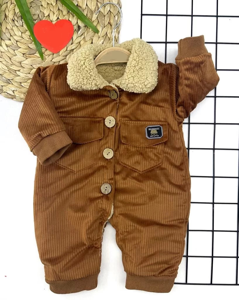 6-9-12-18 Ay Düğme Kapamalı İçi Welsoft Kadife Kumaş Erkek Bebek Tulumu Bej