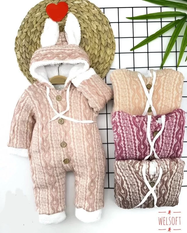 6-9-12-18 Ay Düğme Kapamalı Kulaklı Kapşonlu Motif Desenli Örme Kumaş Kız Erkek Bebek Tulumu Bej