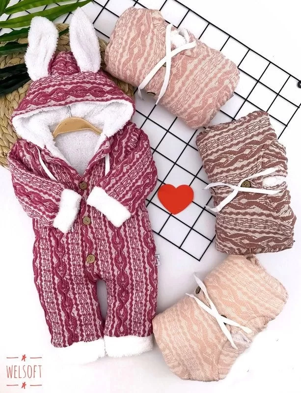 6-9-12-18 Ay Düğme Kapamalı Kulaklı Kapşonlu Motif Desenli Örme Kumaş Kız Erkek Bebek Tulumu Nar Çiçeği