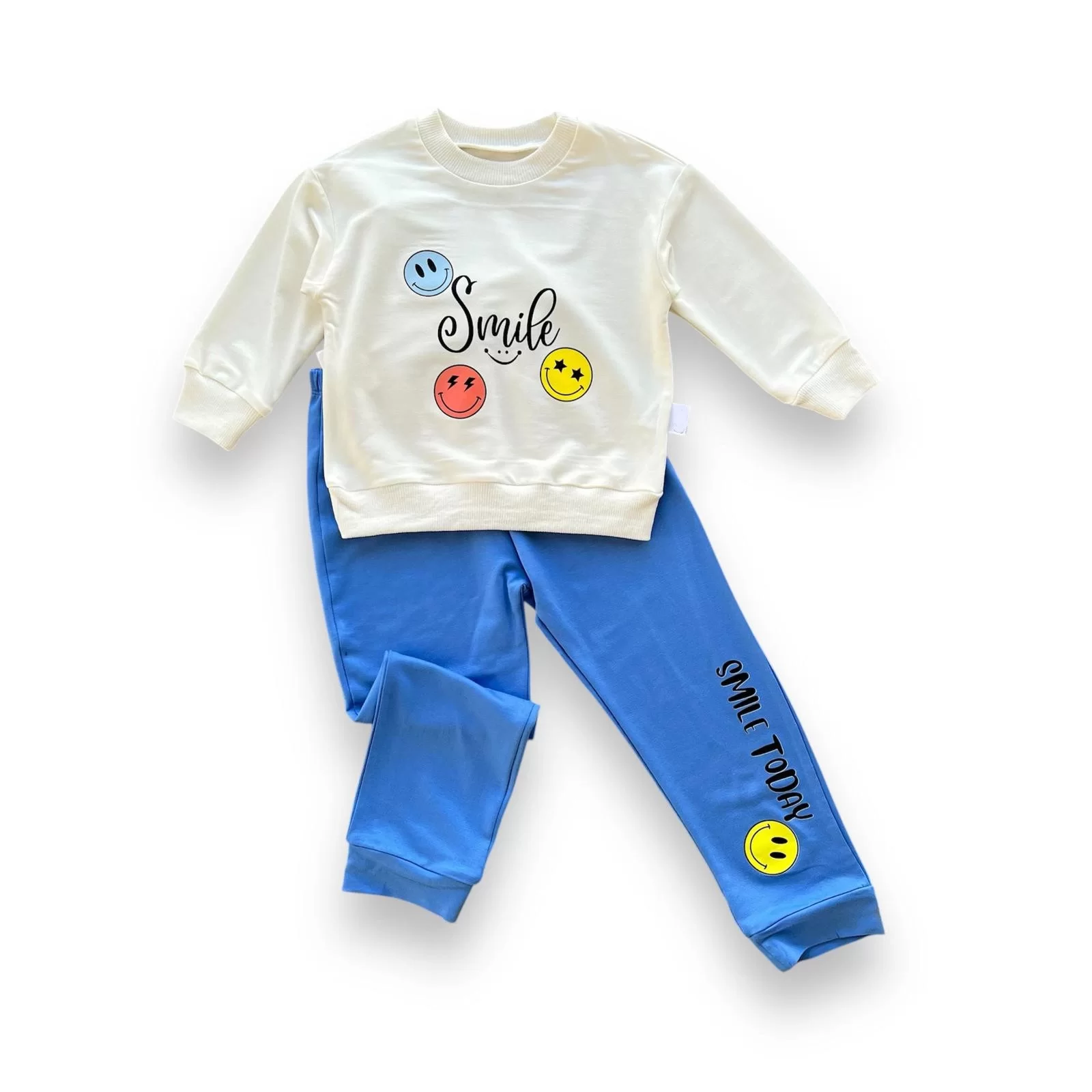 6-9-12-18 Ay Emoje Baskılı Pamuk Penye Kumaş Erkek Bebek Takımı Mavi adet