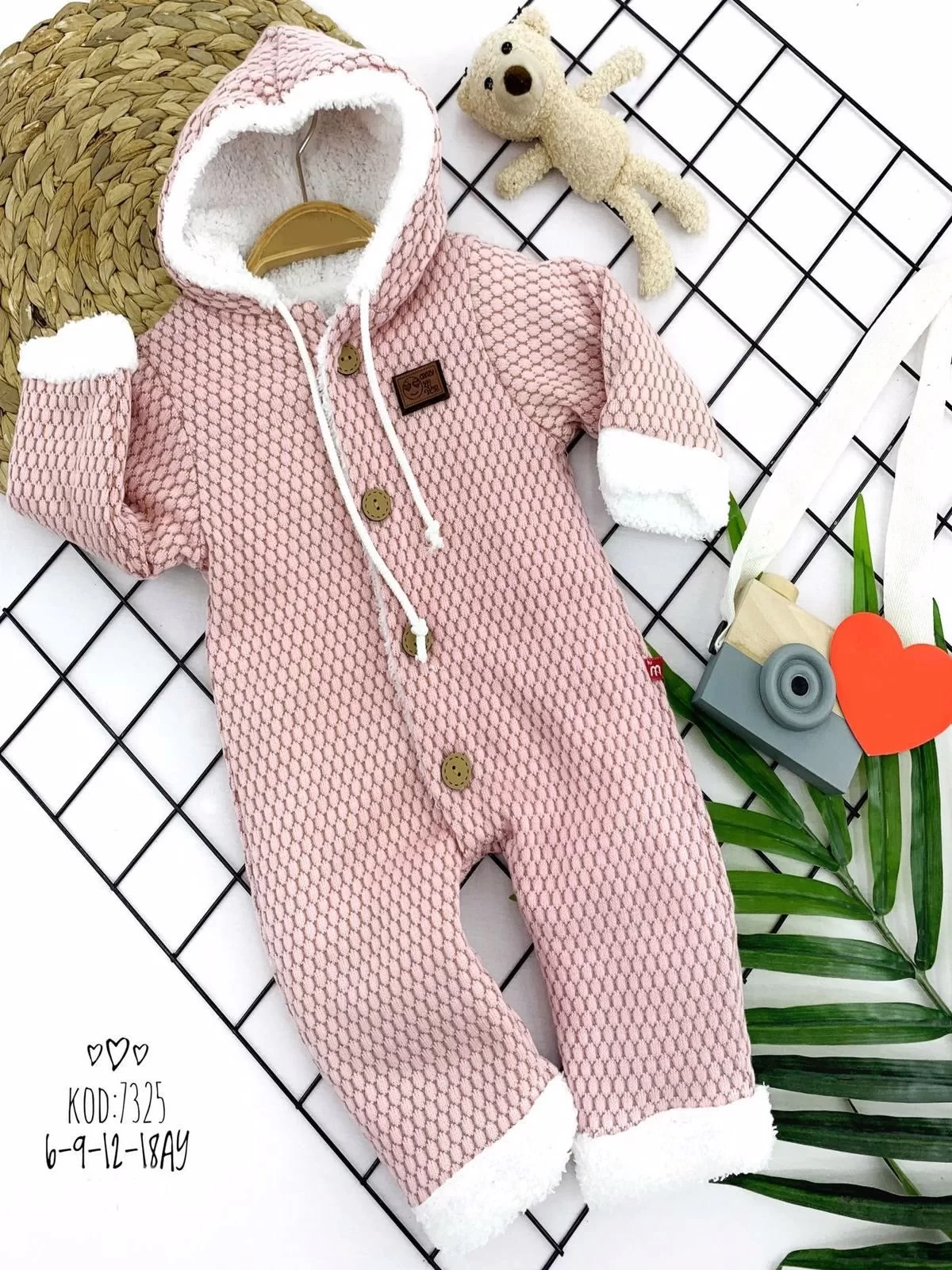 6-9-12-18 Ay İçi Welsoft Düğmeli Kapşonlu Triko Kumaş Kız Erkek Bebek Tulumu Yavruağzı