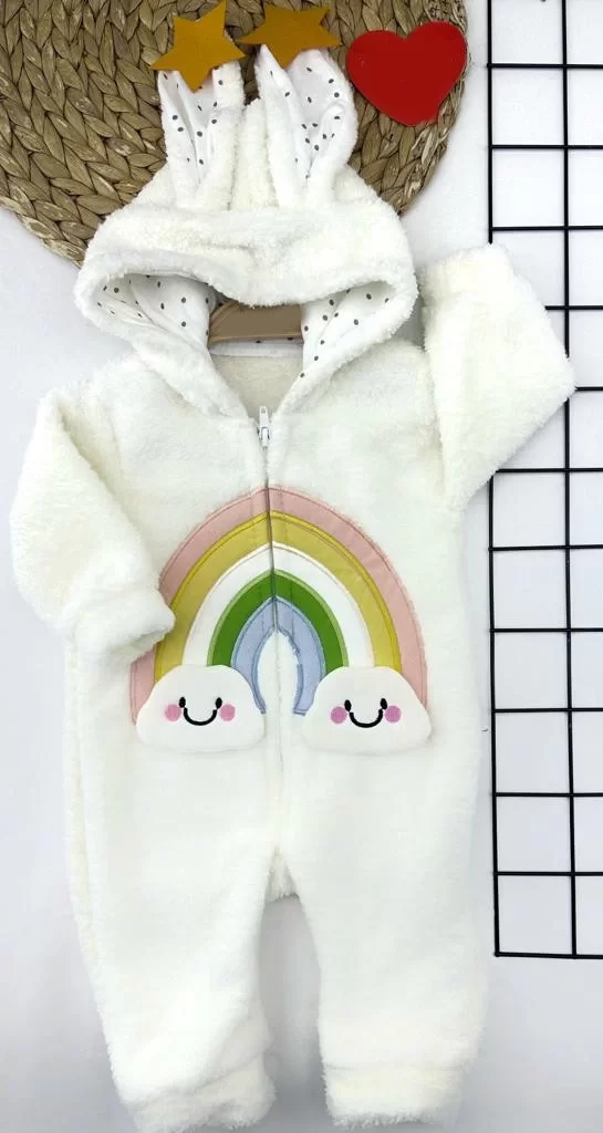 6-9-12-18 Ay Kuzu Tüylü Kumaş Fermuarlı Gökkuşağı Nakışlı Kulaklı Kapşon Kız Erkek Bebek Tulumu Krem