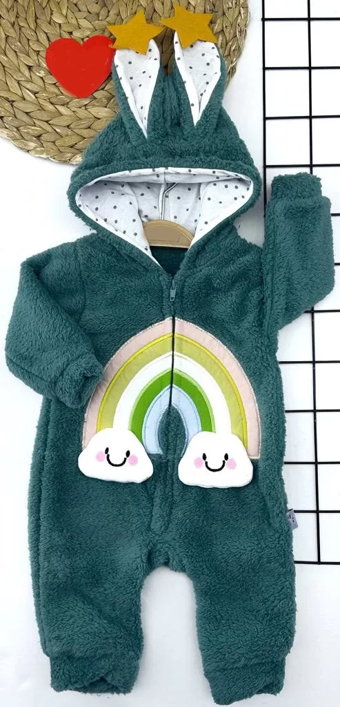 6-9-12-18 Ay Kuzu Tüylü Kumaş Fermuarlı Gökkuşağı Nakışlı Kulaklı Kapşon Kız Erkek Bebek Tulumu Petrol Mavisi