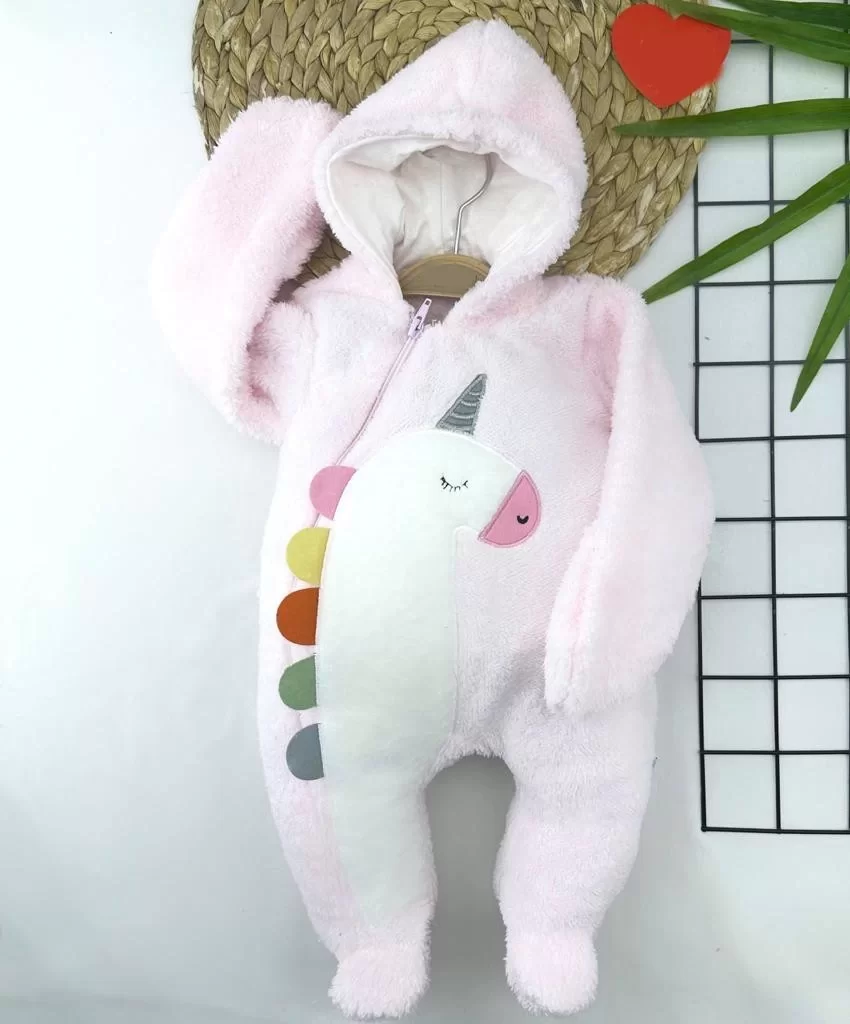 6-9-12-18 Ay Kuzu Tüylü Kumaş Unicorn Nakışlı Kapşonlu Fermuarlı Kız Erkek Bebek Tulumu Pembe