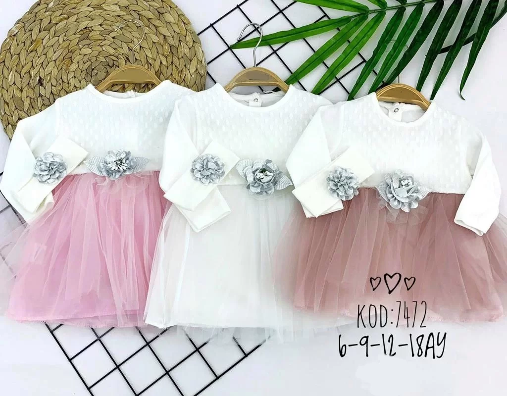 6-9-12-18 Ay Önden Brode Gümüş Çiçek Desenli Bandanalı Astarlı Kız Bebek Elbisesi Pembe