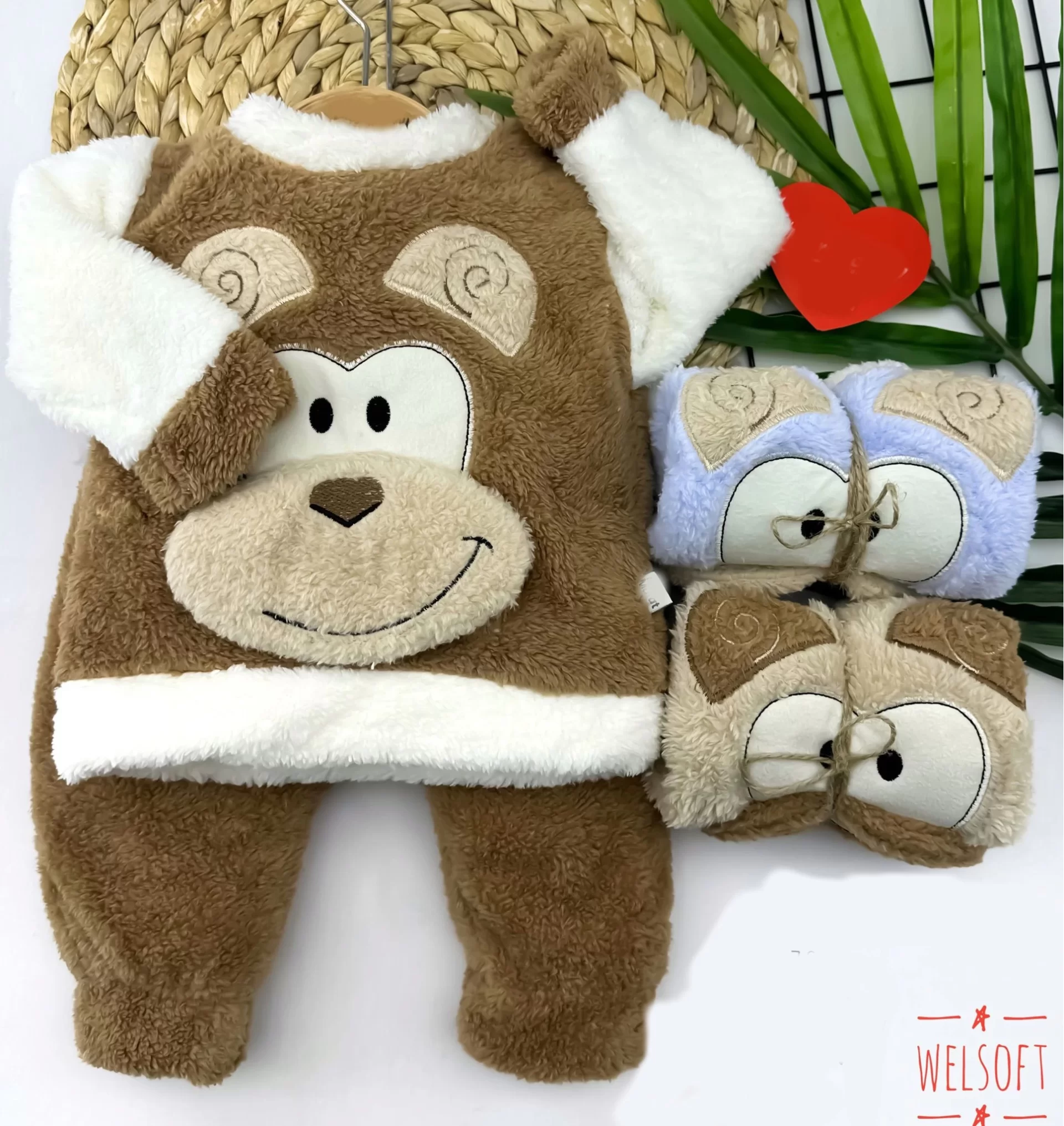 6-9-12-18 Ay Welsoft Kumaş Kulaklı Ayı Desenli Uzun Kollu 2li Kız Erkek Bebek Takımı Bej