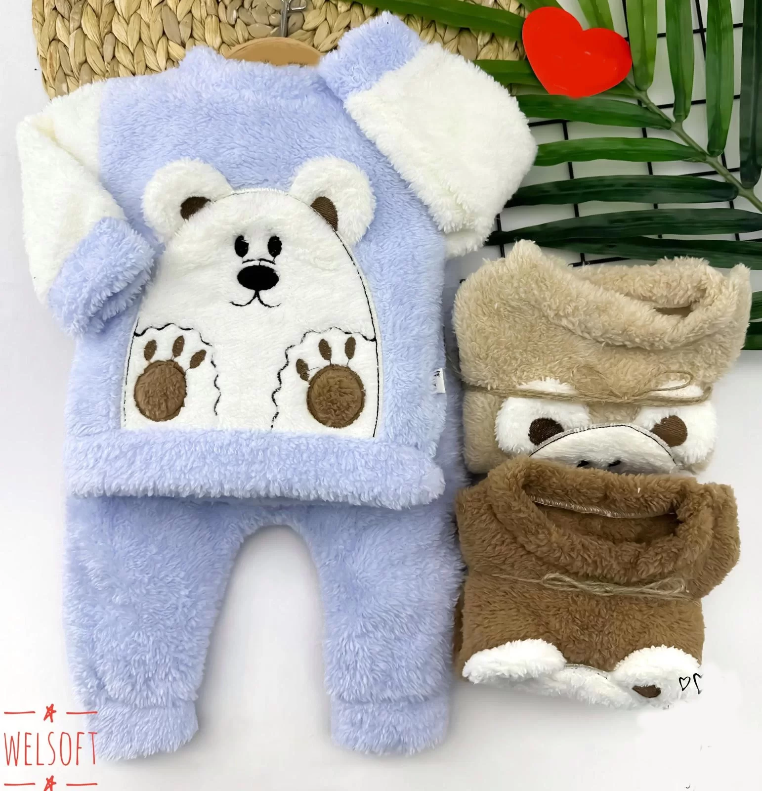 6-9-12-18 Ay Welsoft Kumaş Minik Fare Desenli Uzun Kollu 2li Kız Erkek Bebek Takımı Kahverengi