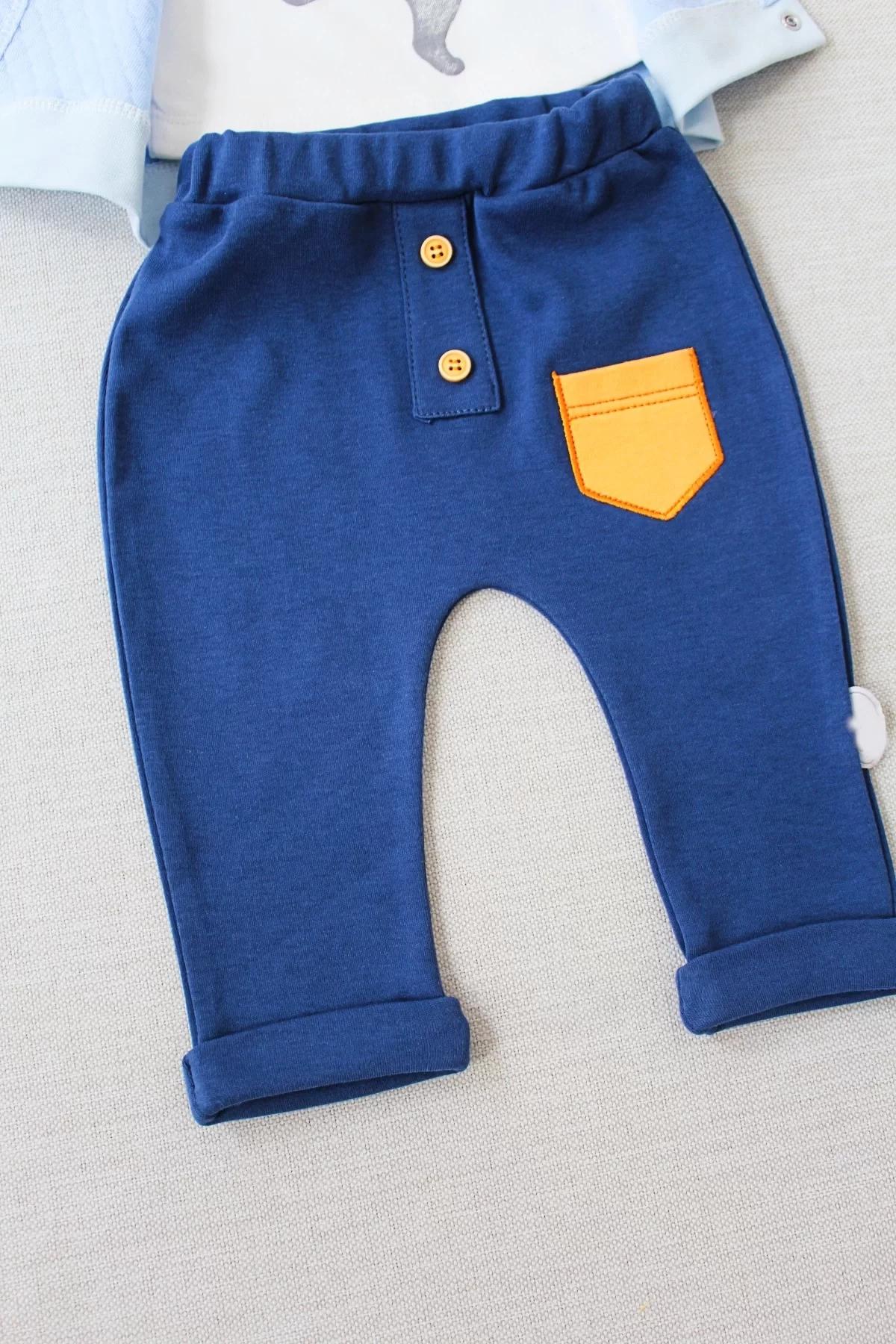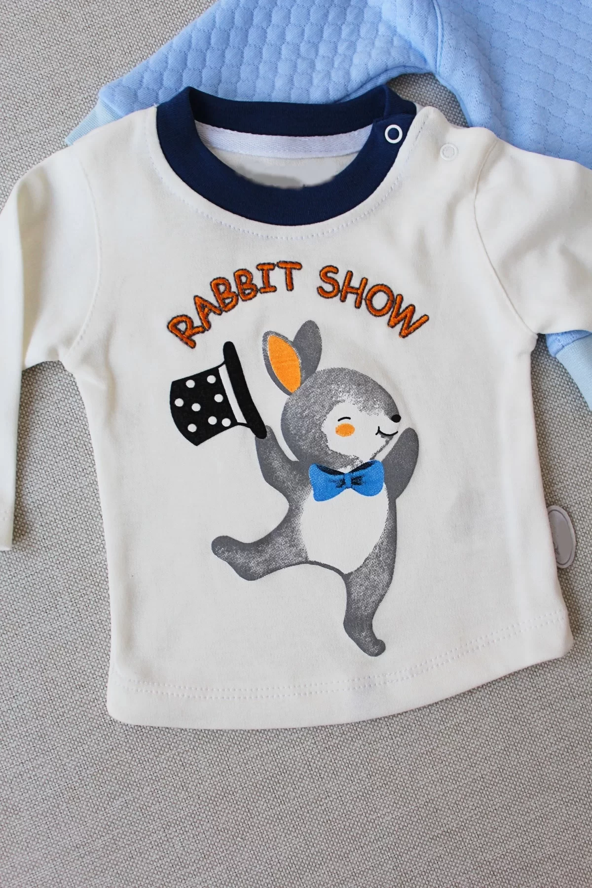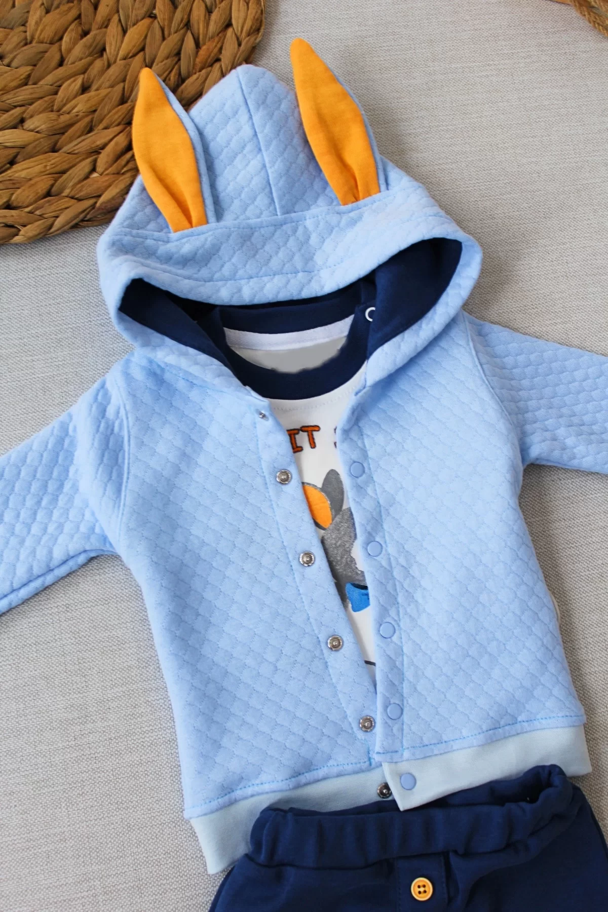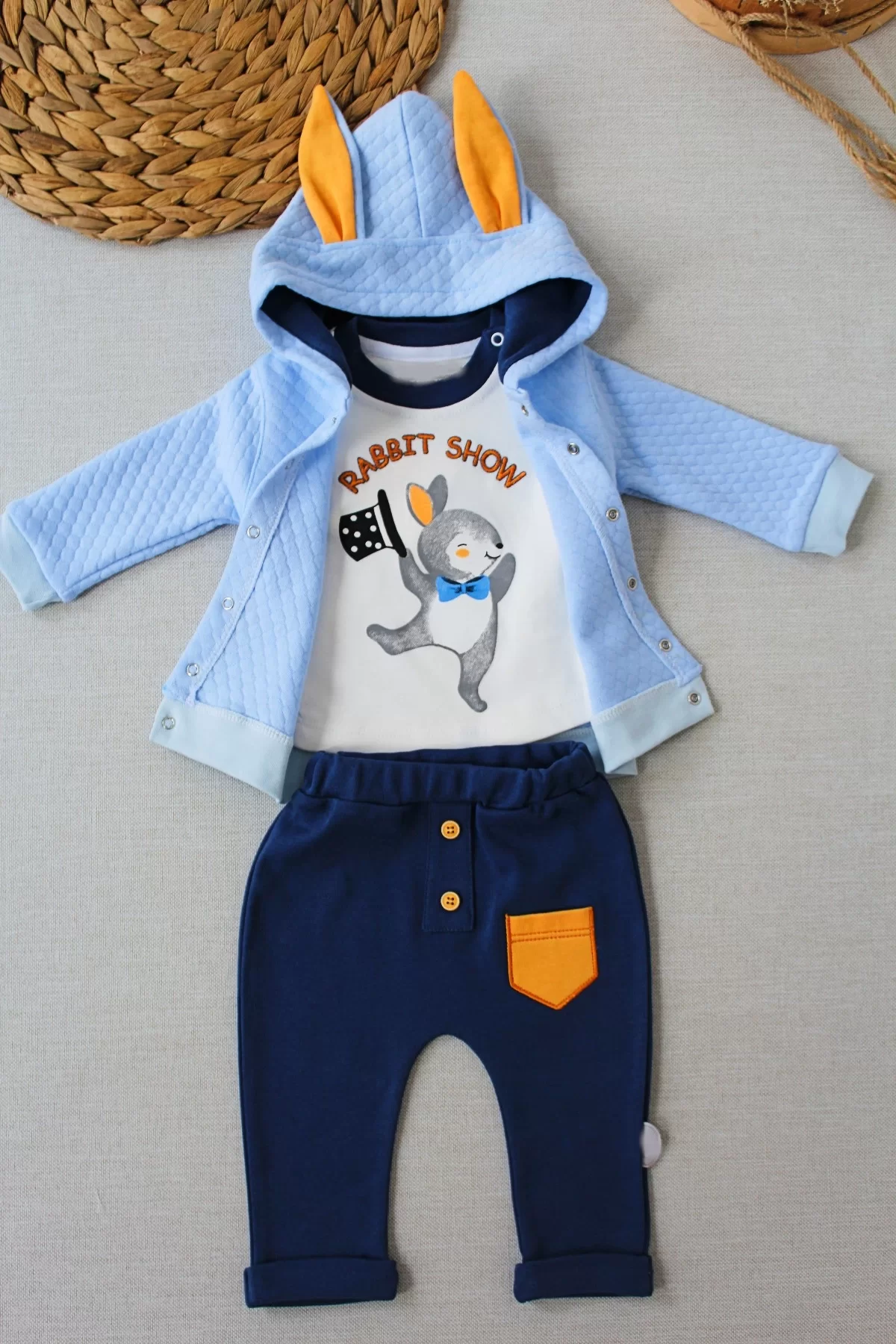 6-9-12 Ay Rabbit Şhow Nakışlı Kapşonlu Ceket Uzun Kollu Sweat Erkek Bebek 3lü Takım Mavi