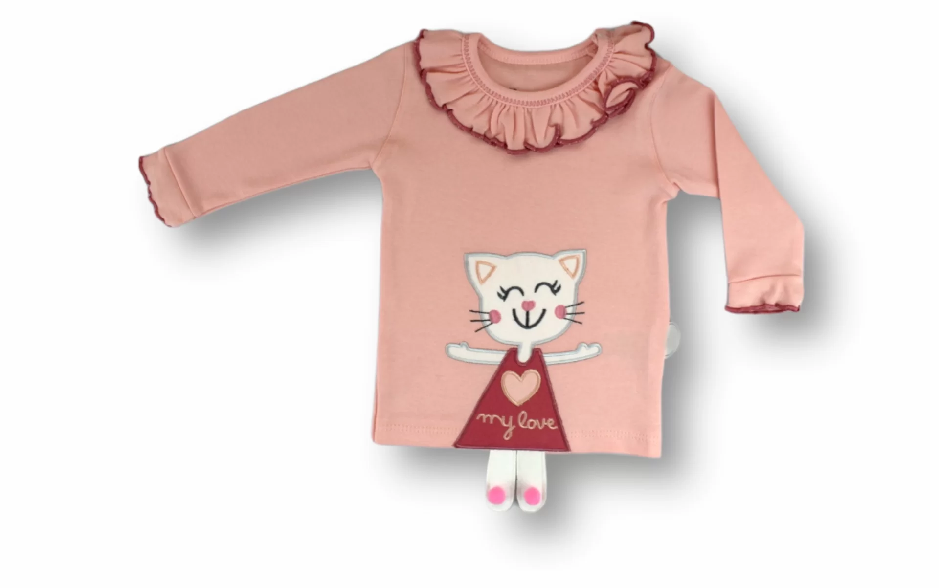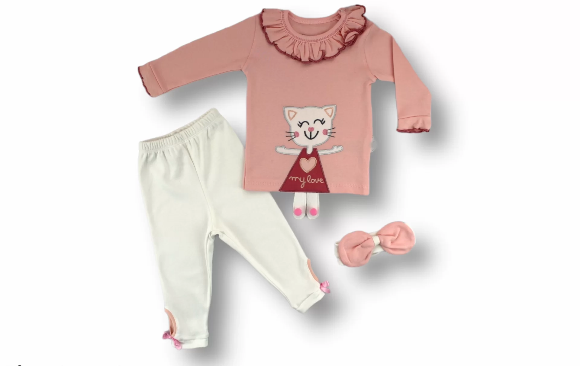 6-9 9-12 12-18 Ay Elbiseli Kedi Nakışlı Bandanalı Uzun Kollu Sweat 3lü Kız Bebek Takımı Pembe