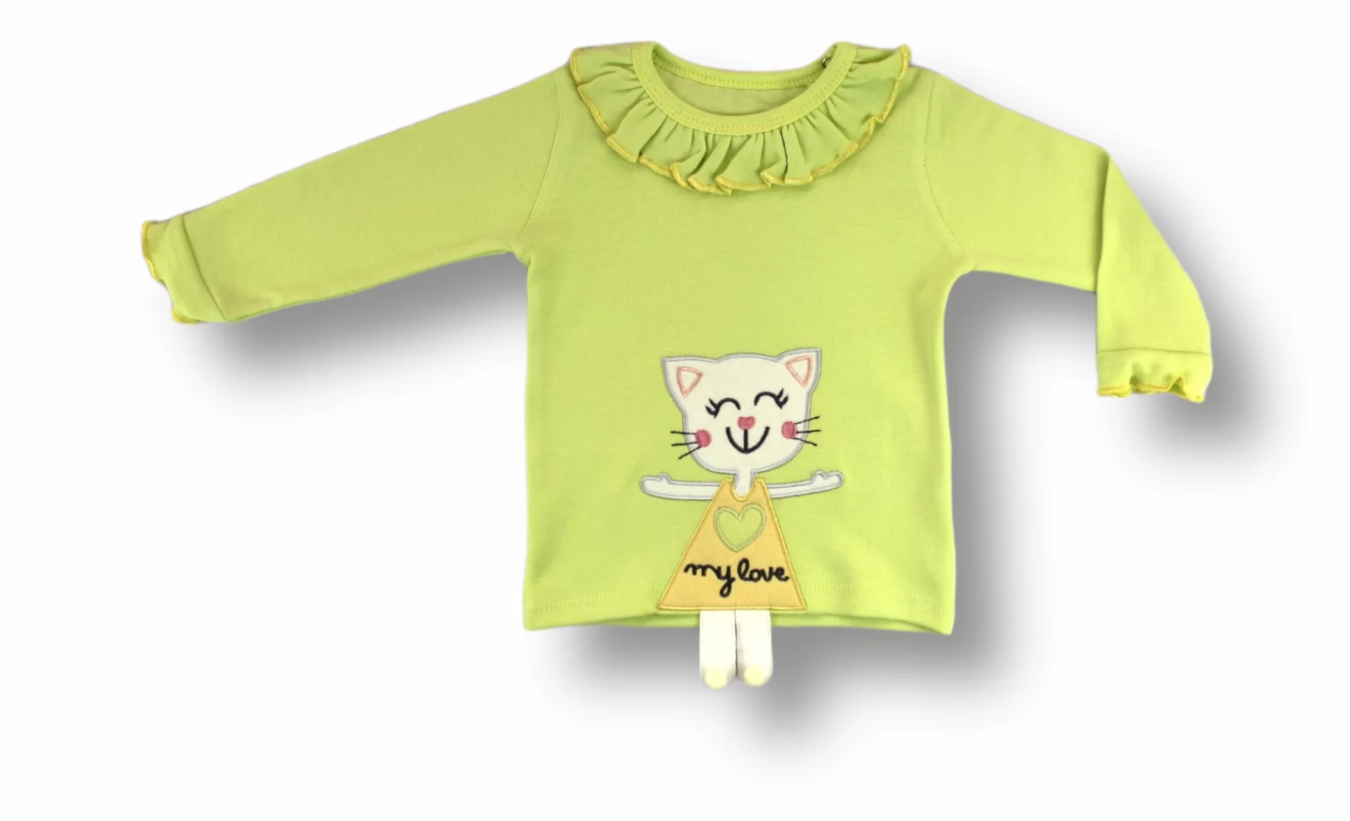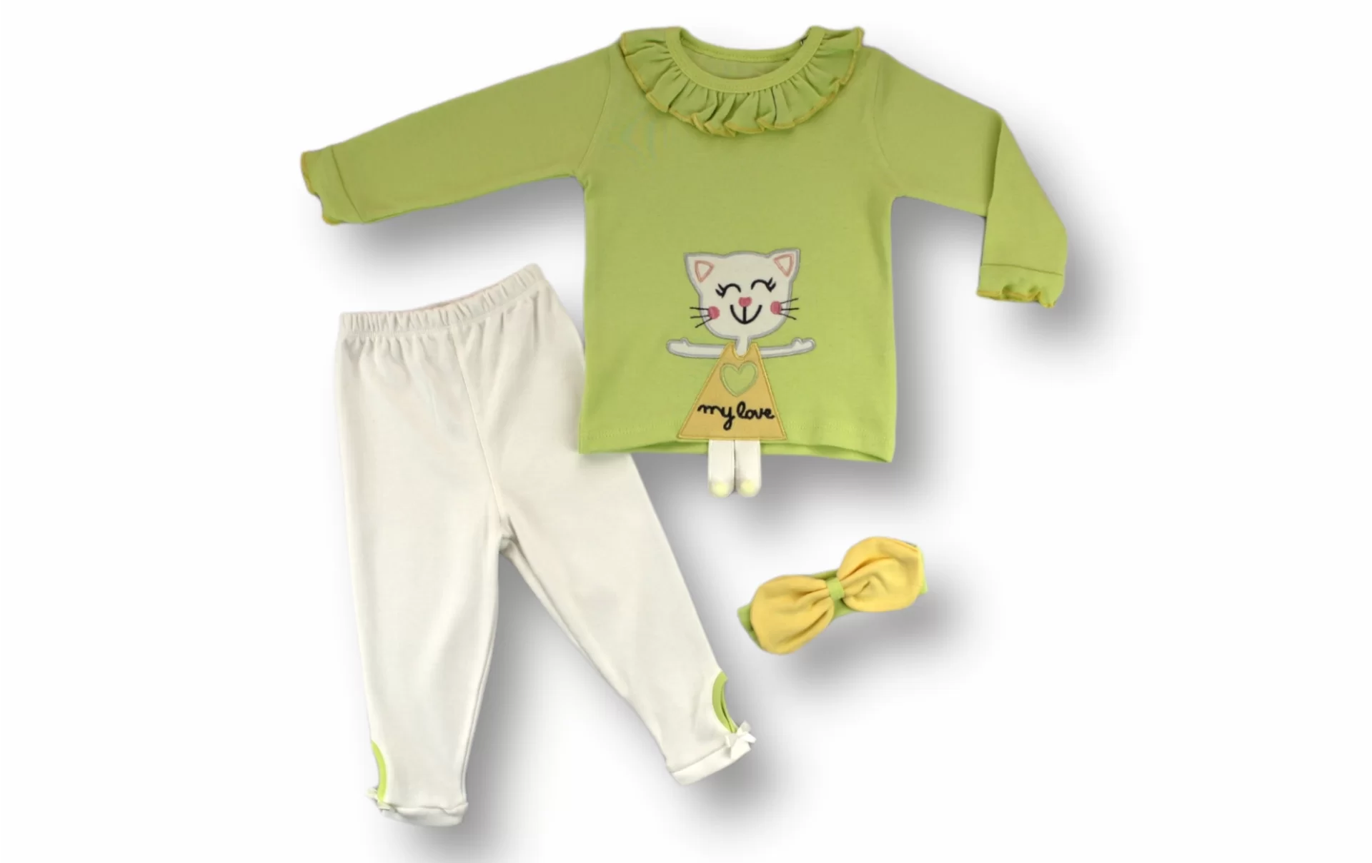 6-9 9-12 12-18 Ay Elbiseli Kedi Nakışlı Bandanalı Uzun Kollu Sweat 3lü Kız Bebek Takımı Yeşil