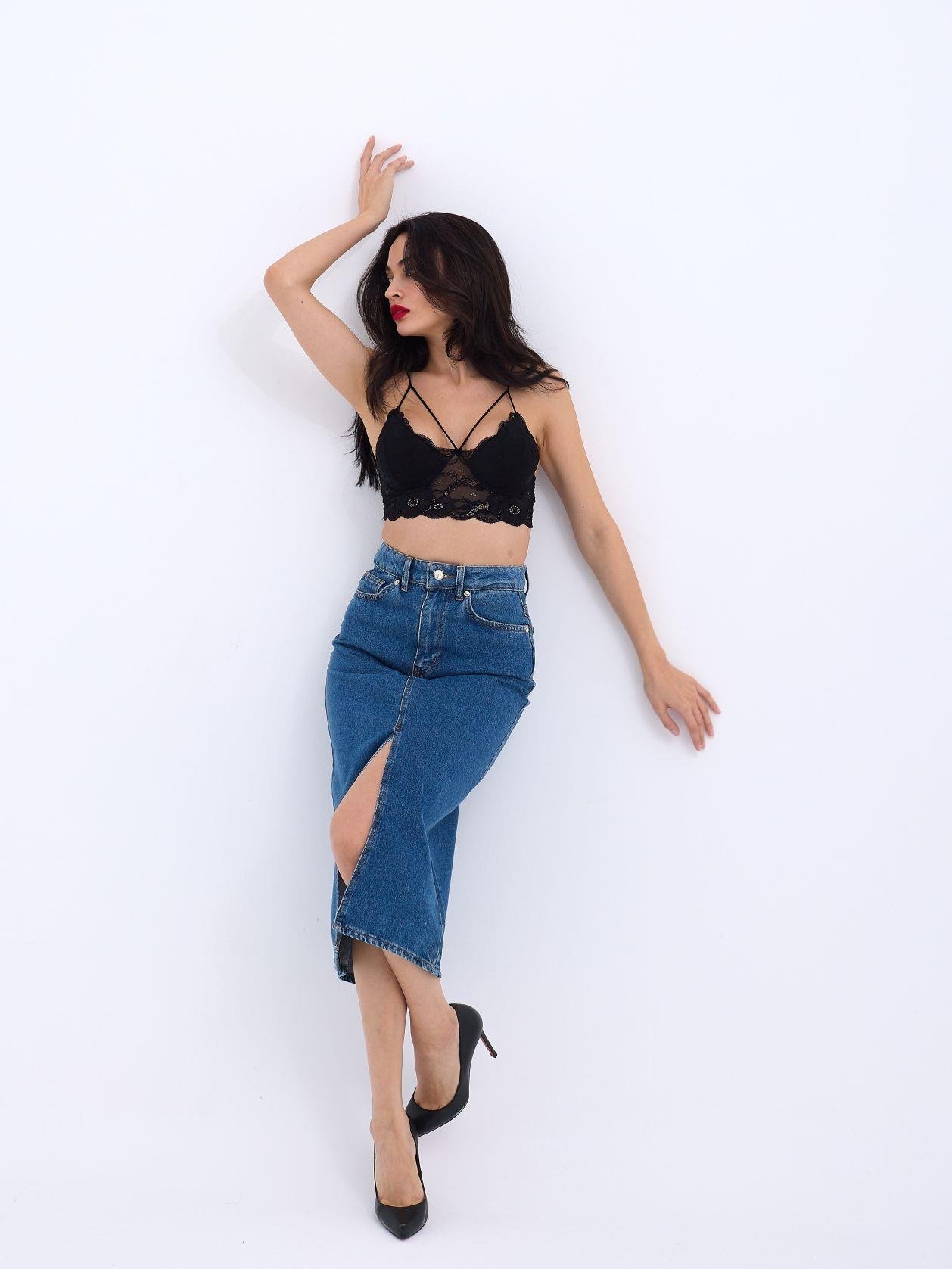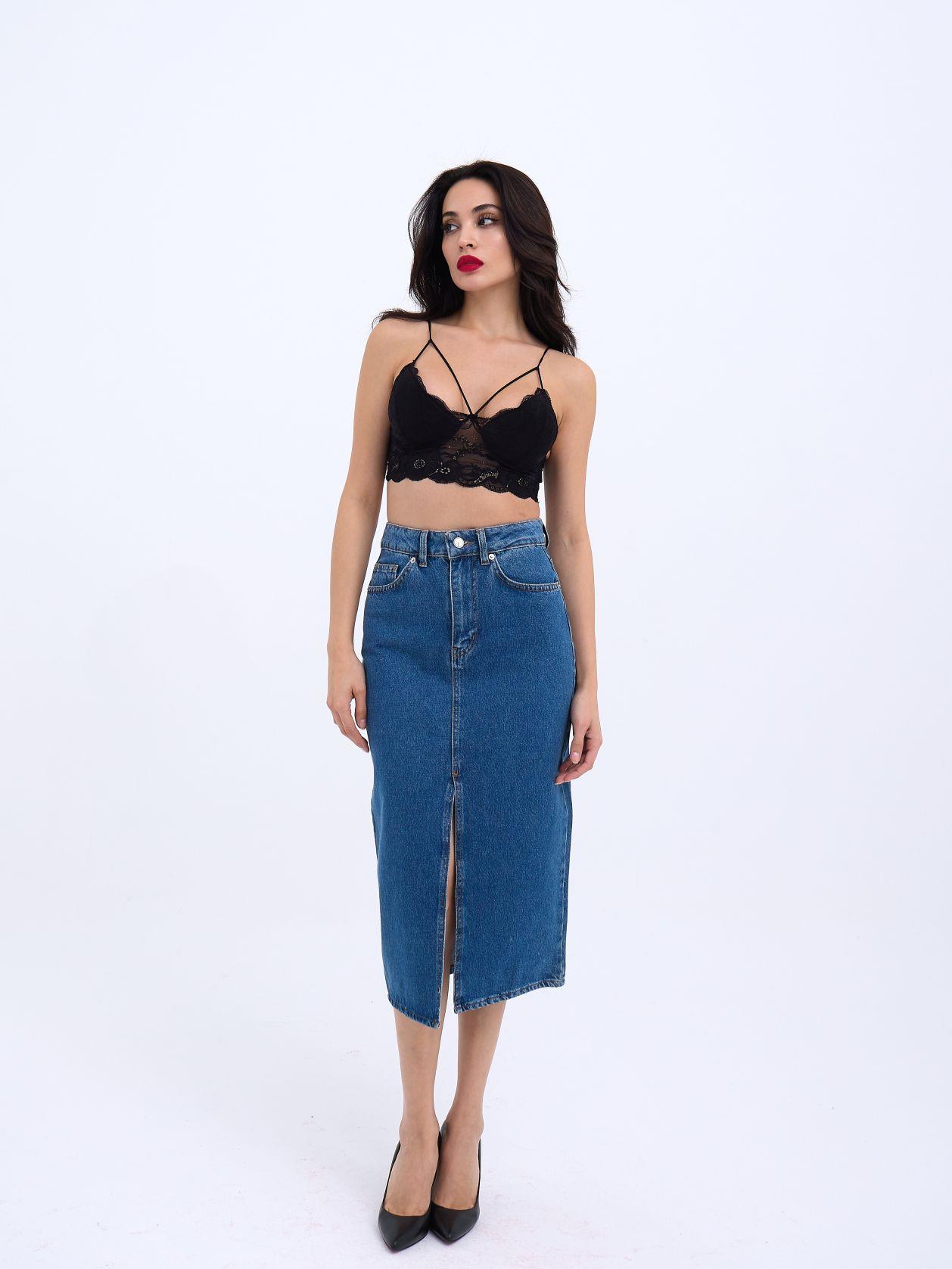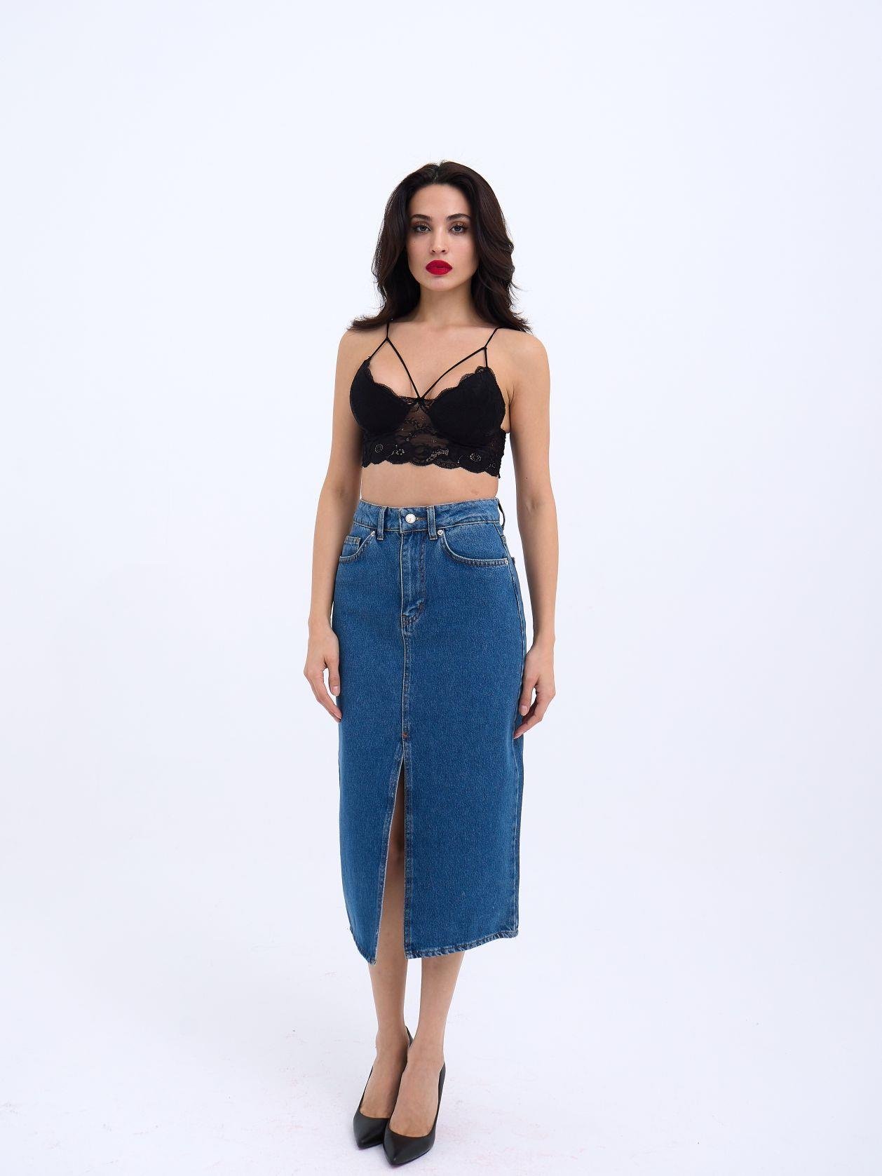 6471 DENİM MIDI SLIT SKIRT-KOYU MAVİ