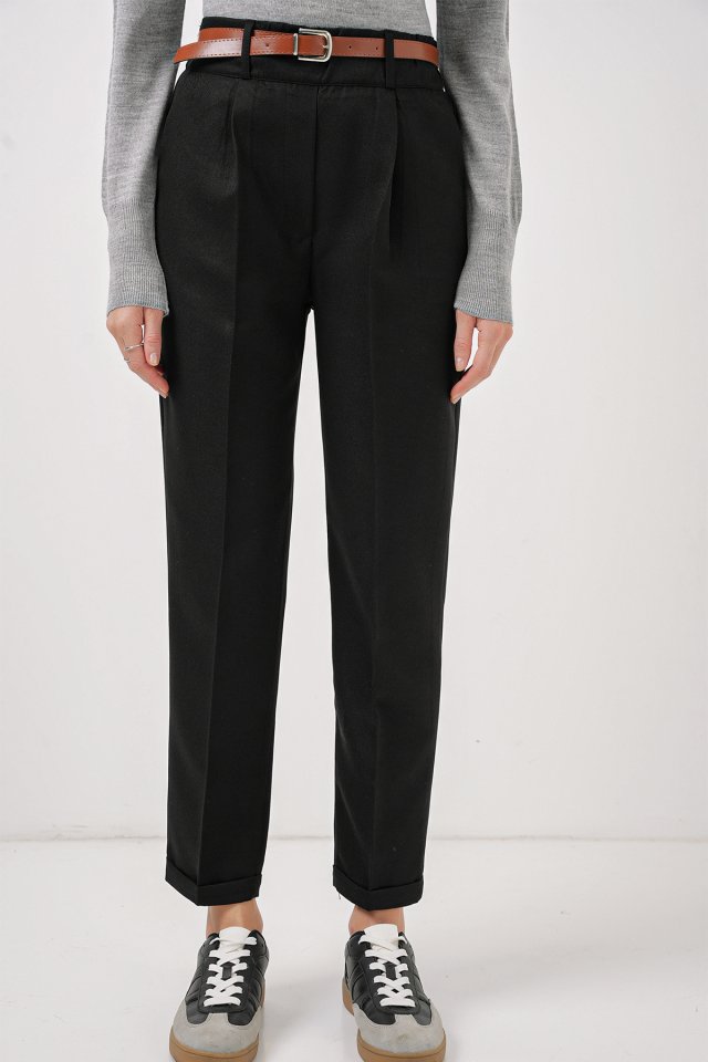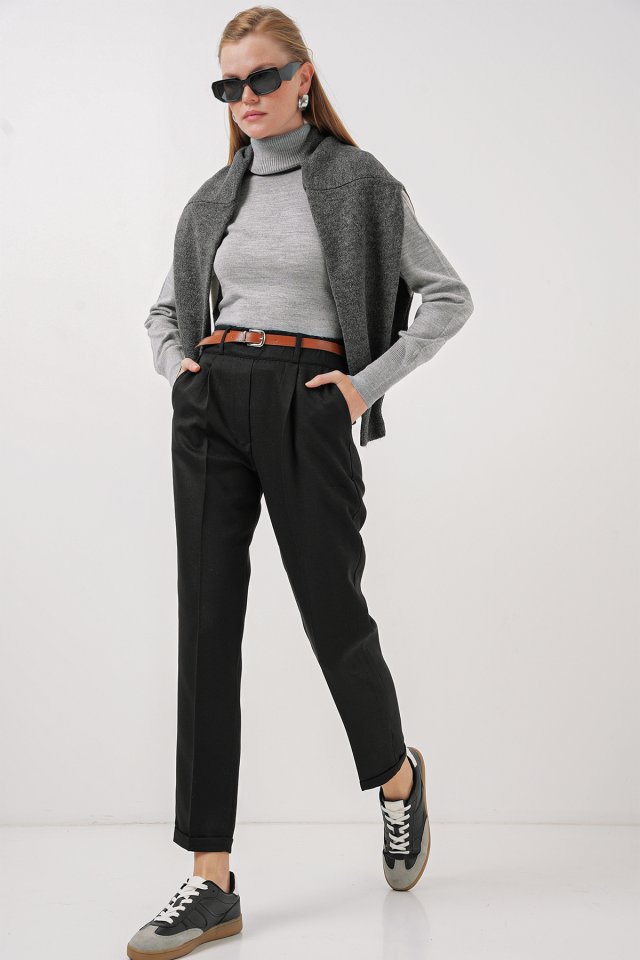 6686 Pileli Kemerli Kumaş Pantolon – Siyah