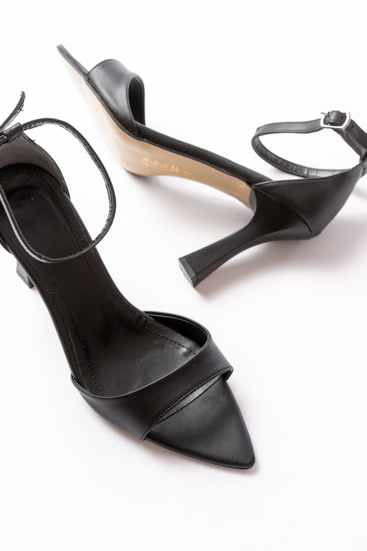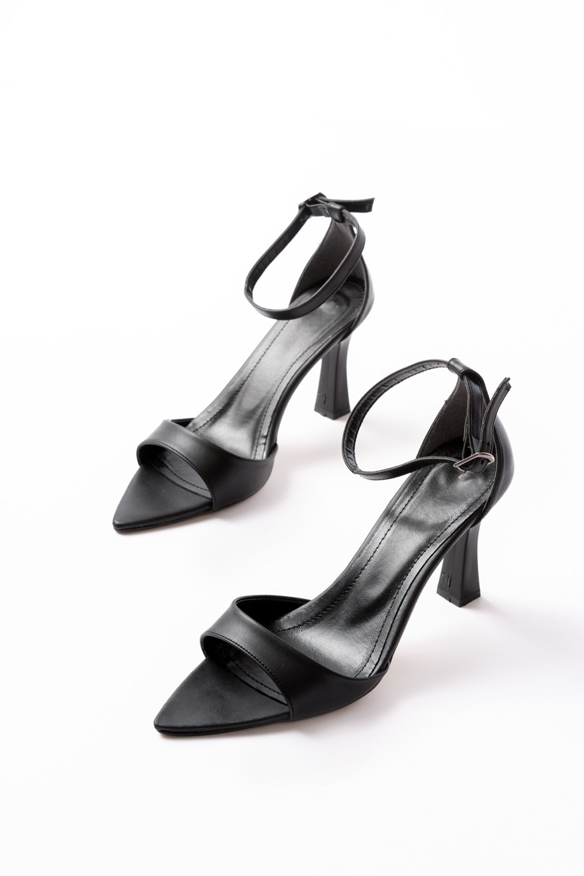 718 Siyah Cilt Sivri Burunlu Topuklu Bilekten Bağlamalı Kadın Ayakkabı