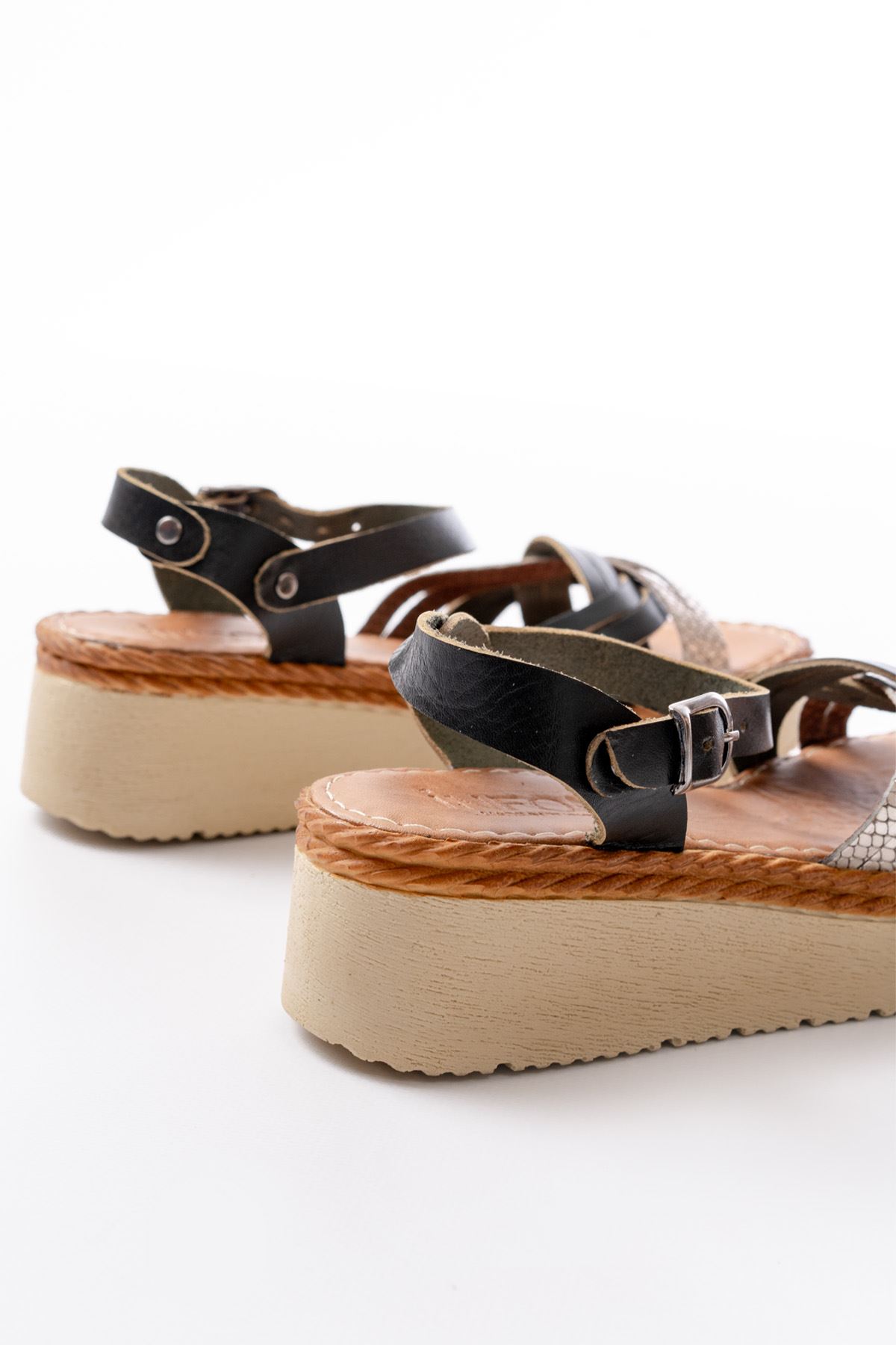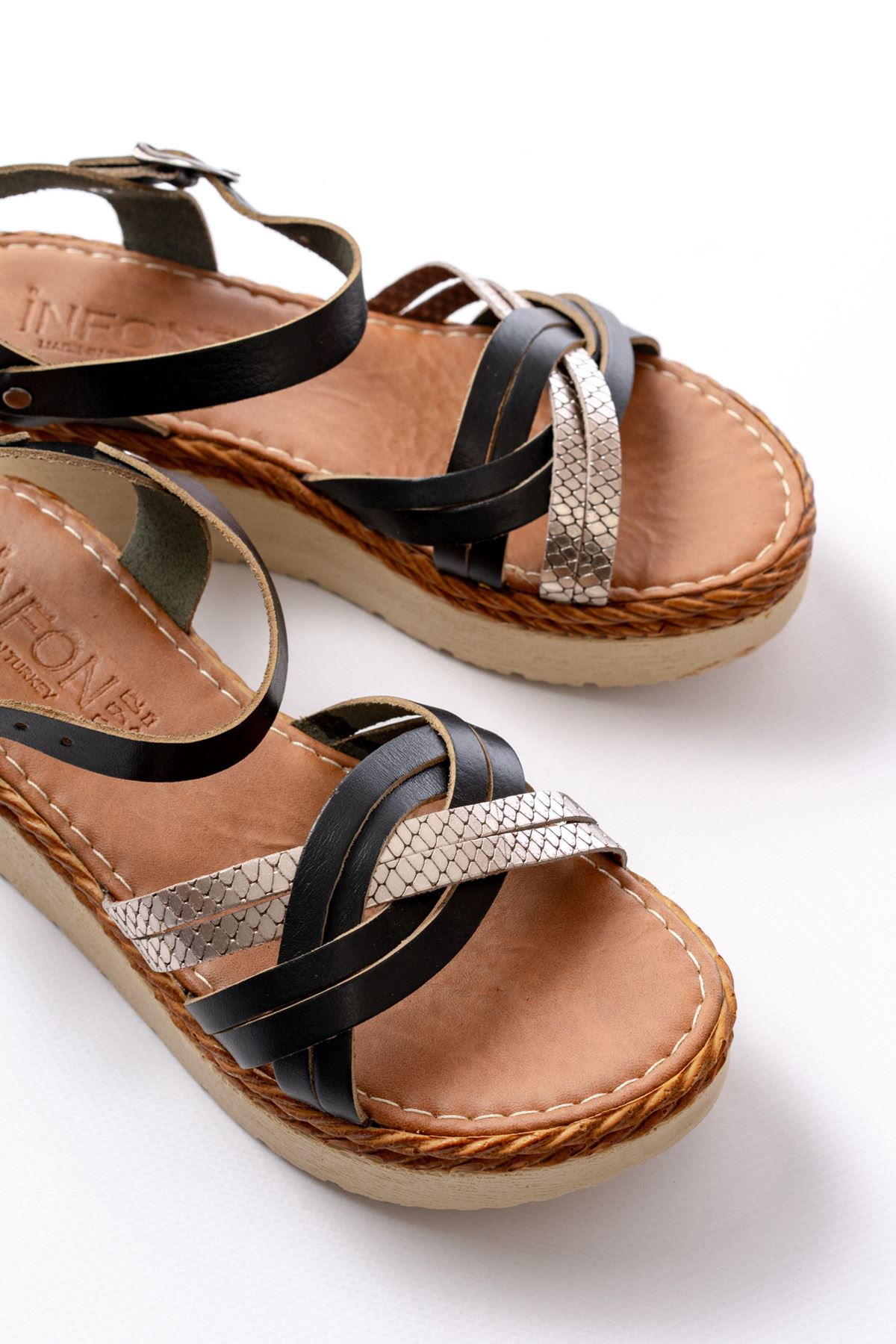 730-037 Siyah Ayna Hakiki Deri Ortopedik Taban Kadın Sandalet
