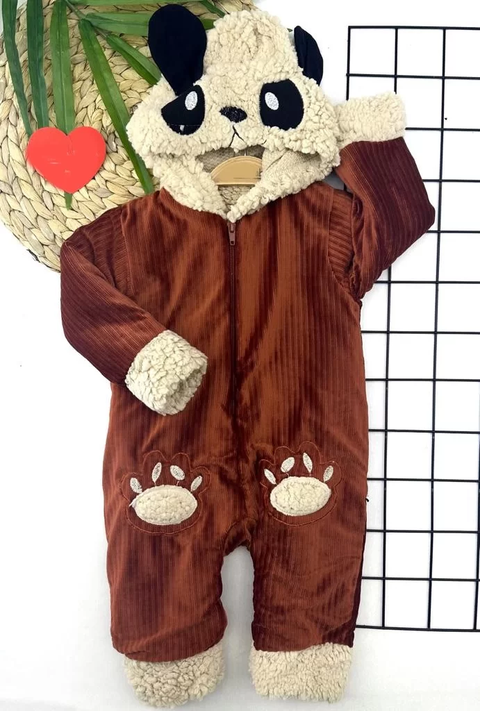 9-12-18-24 Ay Ayıcık Kapşonlu İçi Tüylü Fermuar Kapamalı Kadife Kumaş Kız Erkek Bebek Tulumu Kahverengi