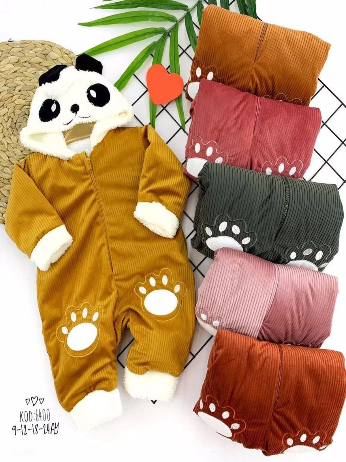 9-12-18-24 Ay Ayıcık Kapşonlu İçi Tüylü Fermuar Kapamalı Kadife Kumaş Kız Erkek Bebek Tulumu Pembe