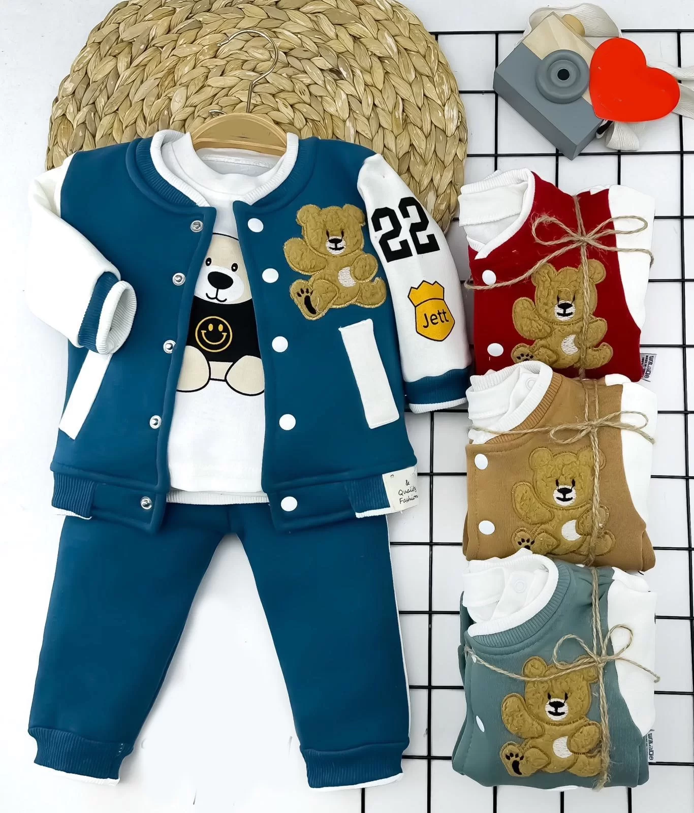 9-12-18-24 Ay Ayıcık Nakışlı Düğmeli Ceket Pantolon Uzun Kollu Sweatli 3lü Kız Erkek Bebek Takımı