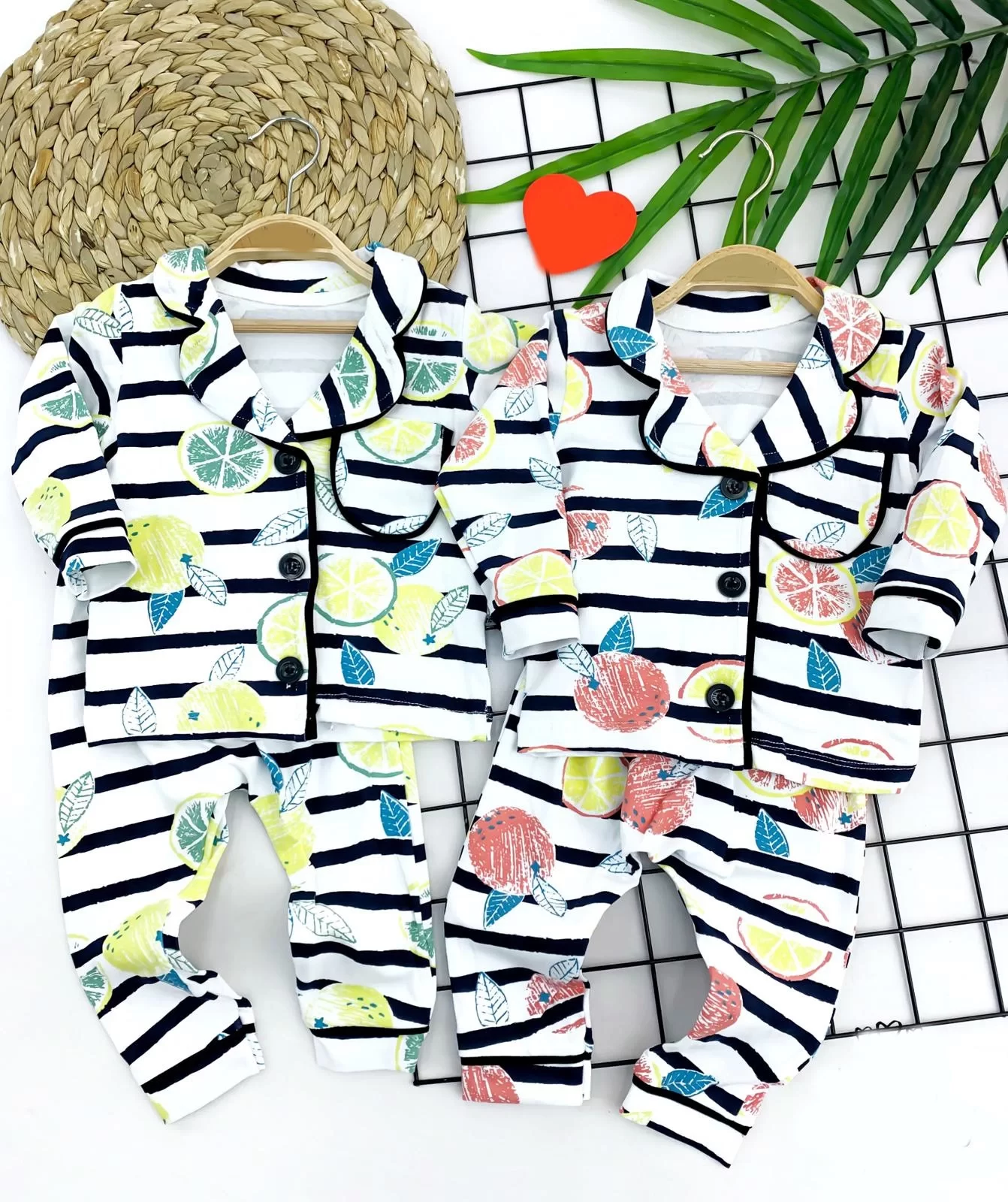 9-12-18-24 Ay Çizgili Meyve Desenli Düğme Kapamalı 2li Kız Erkek Bebek Pijama Takımı