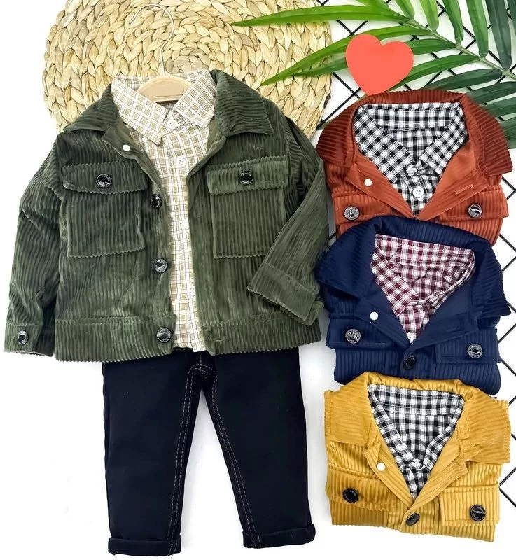 9-12-18-24 Ay Düğme Kapamalı Kadife Ceket Uzun Kollu Gömlek Kot Pantolon 3lü Erkek Bebek Takımı
