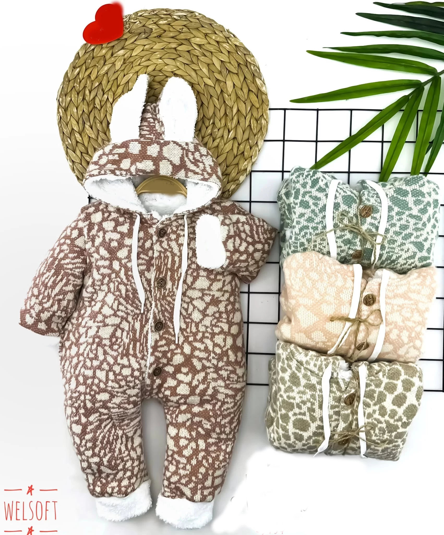 9-12-18-24 Ay Düğme Kapamalı Kulaklı Kapşonlu Batik Desenli Triko Kumaş Kız Erkek Bebek Tulumu Bej