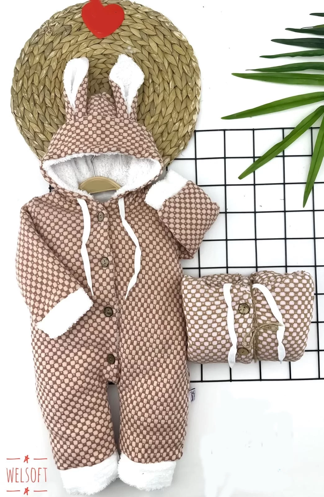 9-12-18-24 Ay Düğme Kapamalı Kulaklı Kapşonlu Piti Kare Desenli Triko Kumaş Kız Erkek Bebek Tulumu Kahverengi