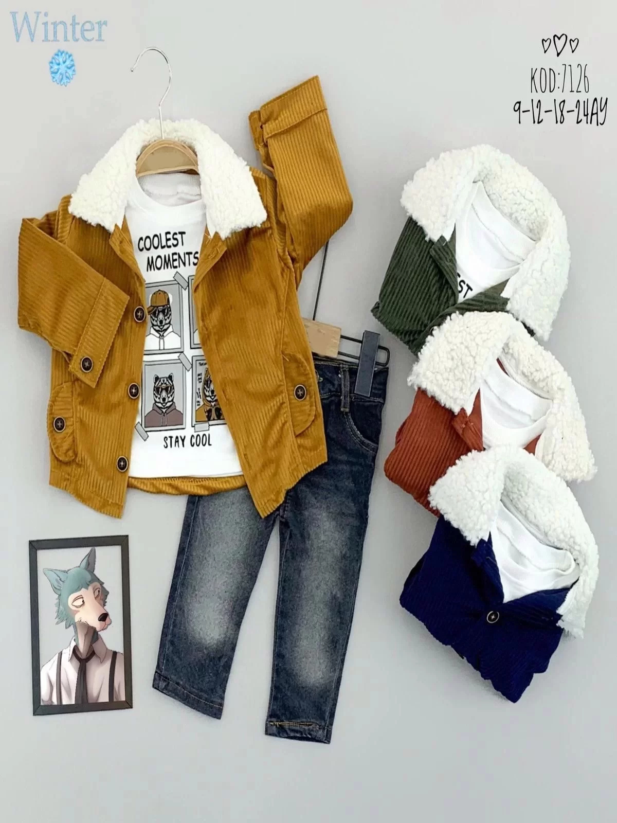 “9-12-18-24 Ay Düğme Kapamalı Yakalı Ceket Uzun Kollu Sweatli Kot Pantolonlu 3lü Erkek Bebek Takımı Yeşil” için yorum yapan ilk kişi siz olun